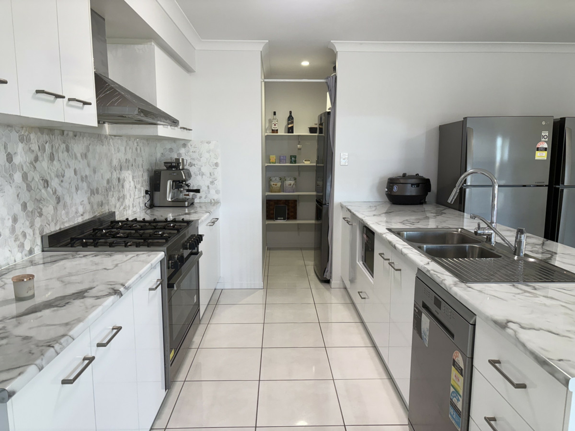 - Gourmet kitchen with 5-burner gas cooktop, quality appliances, island bench, and walk-in pantry