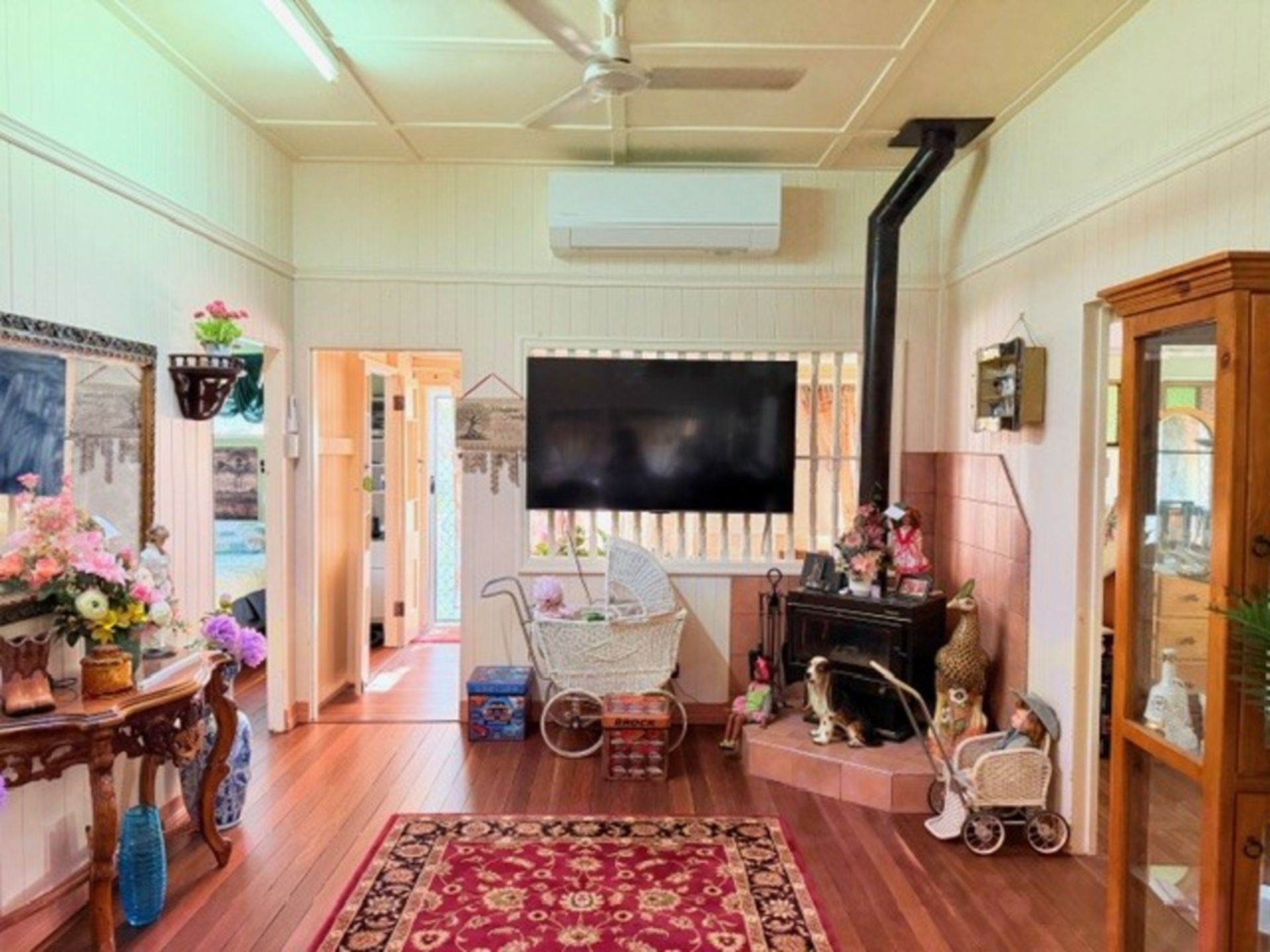•beautiful timber floors , new aircon and wood burner heater in the Central lounge area of the home .