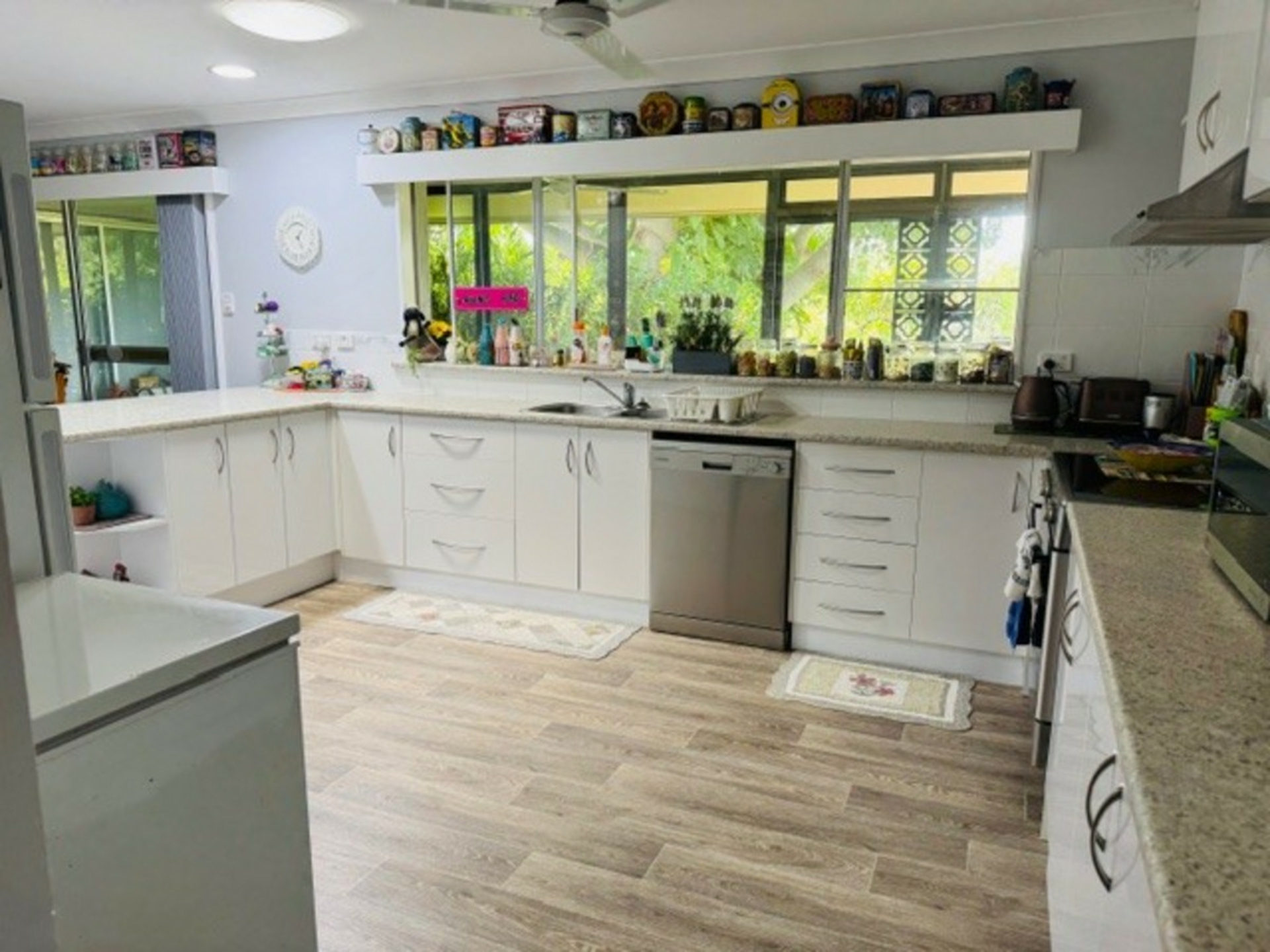 Accommodation is generous, offering four well-sized bedrooms plus a versatile additional room that can be used as a fifth bedroom, craft room, or hobby space. A dedicated office with built-in shelving provides an ideal work-from-home solution. The home is fully air-conditioned throughout and features extensive custom storage cabinetry and cupboards, ensuring practicality and comfort at every turn.