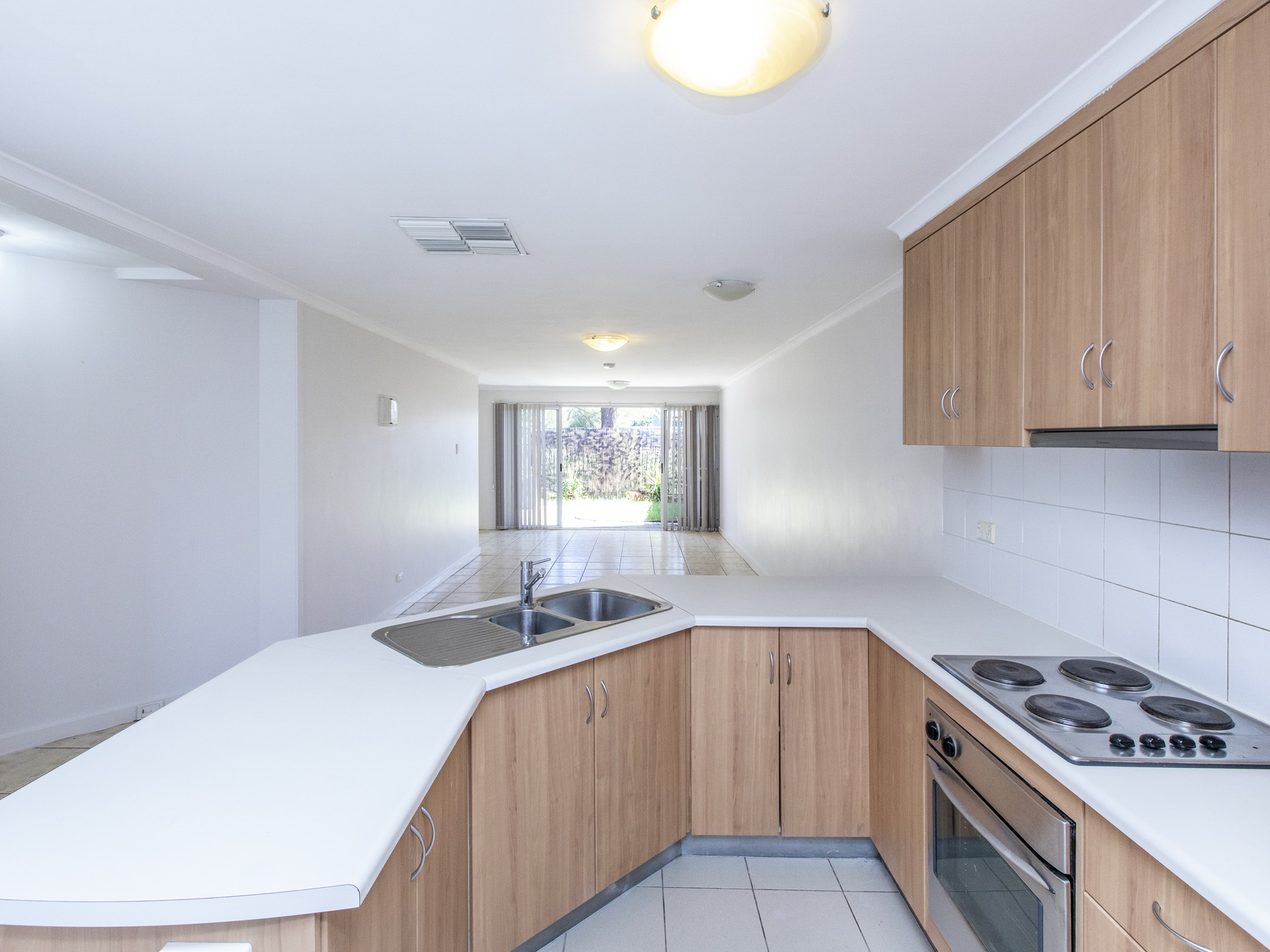 The kitchen is a wrap around shape, with a double sink and plenty of bench space/storage. Electric cooking appliances and a tiled splashback give this kitchen a modern feel.