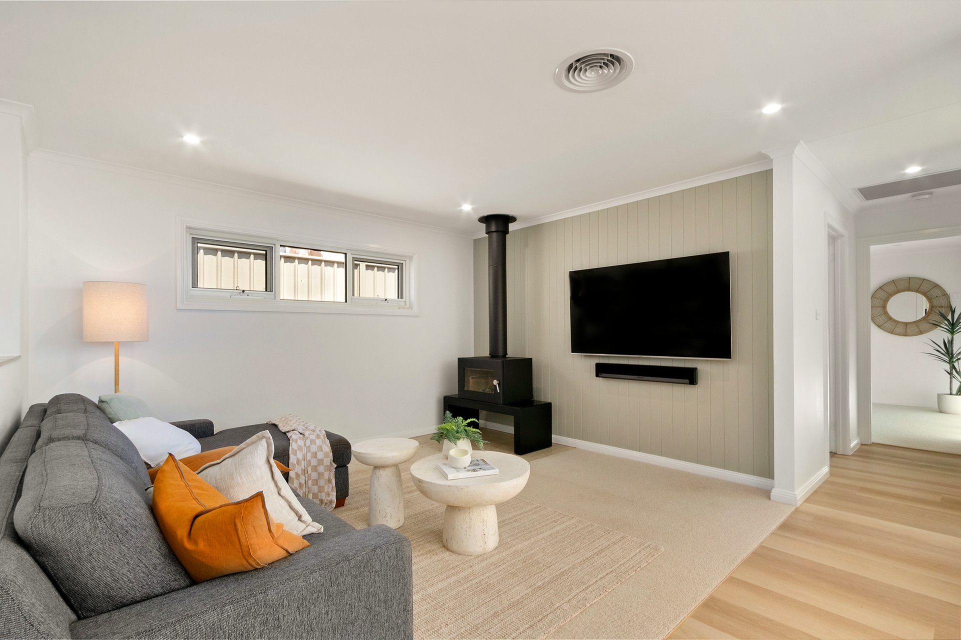 Seamless living with light, flow and connection: Open-plan, light-filled living spans the generous lounge into the kitchen, dining and family living zone, where a feature log fireplace anchors the space. Designed for everyday living and entertaining, the space connects to the alfresco via pillarless sliding doors, creating true indoor-outdoor living with views of the surrounding mountaintops.