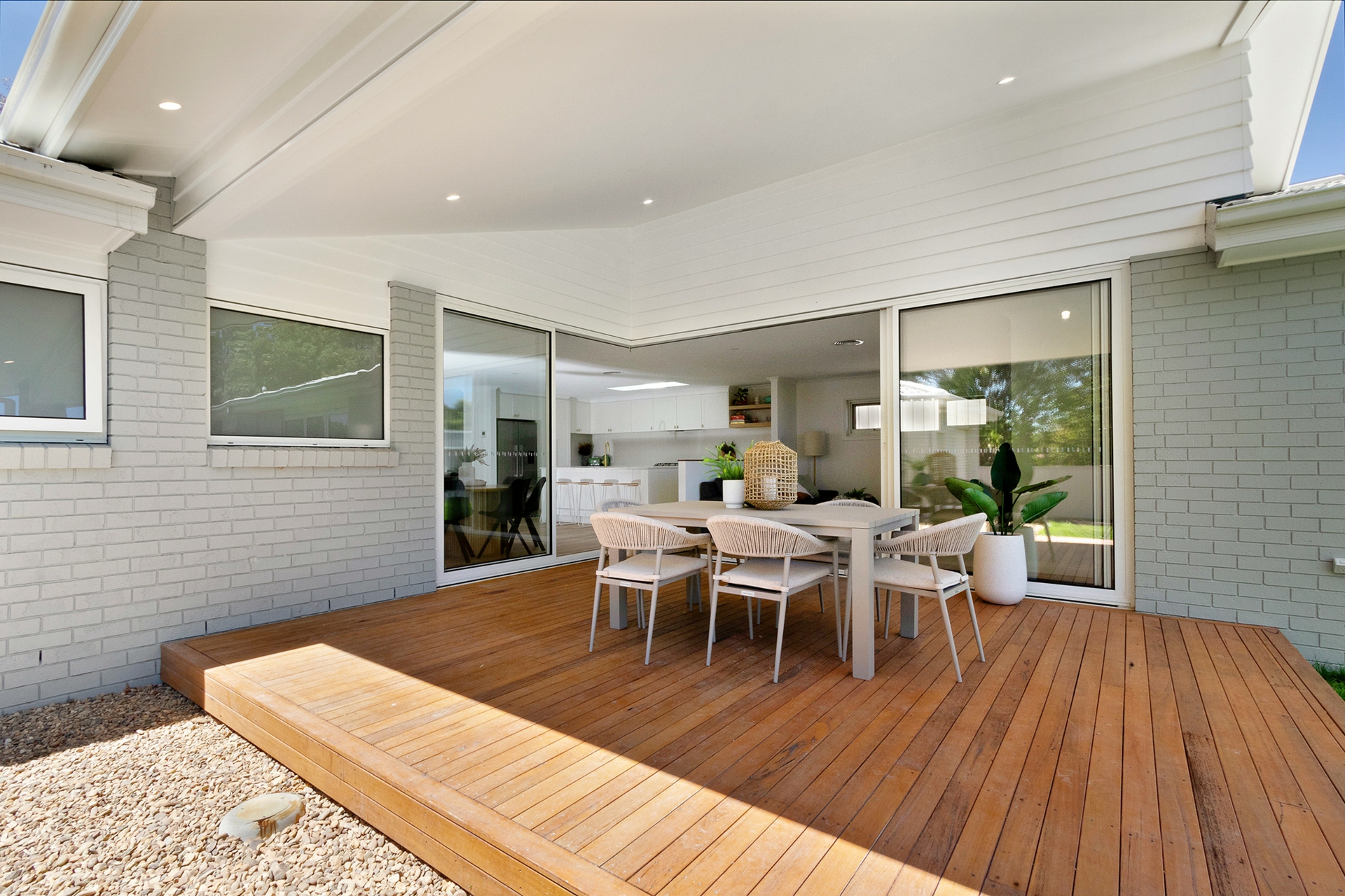 •Pillarless corner sliding doors opening to covered alfresco with pitched roof, LED lights and ash deck