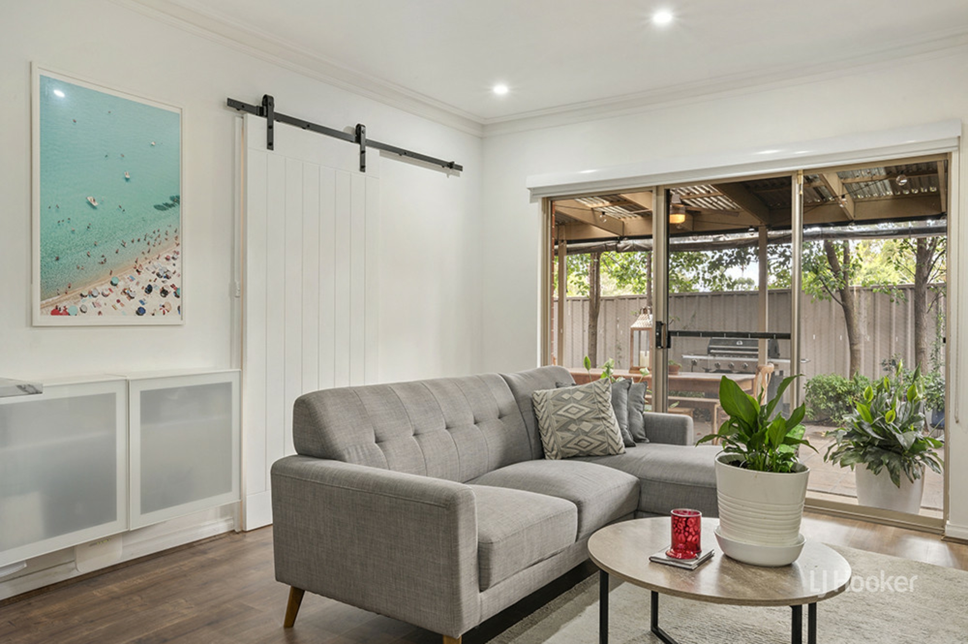 The modern white kitchen overlooks the north facing family/meals area with sliding doors leading out to a paved outdoor entertaining area with ceiling fans and cafe blinds creating an additional living space, ideal for all weather entertaining.