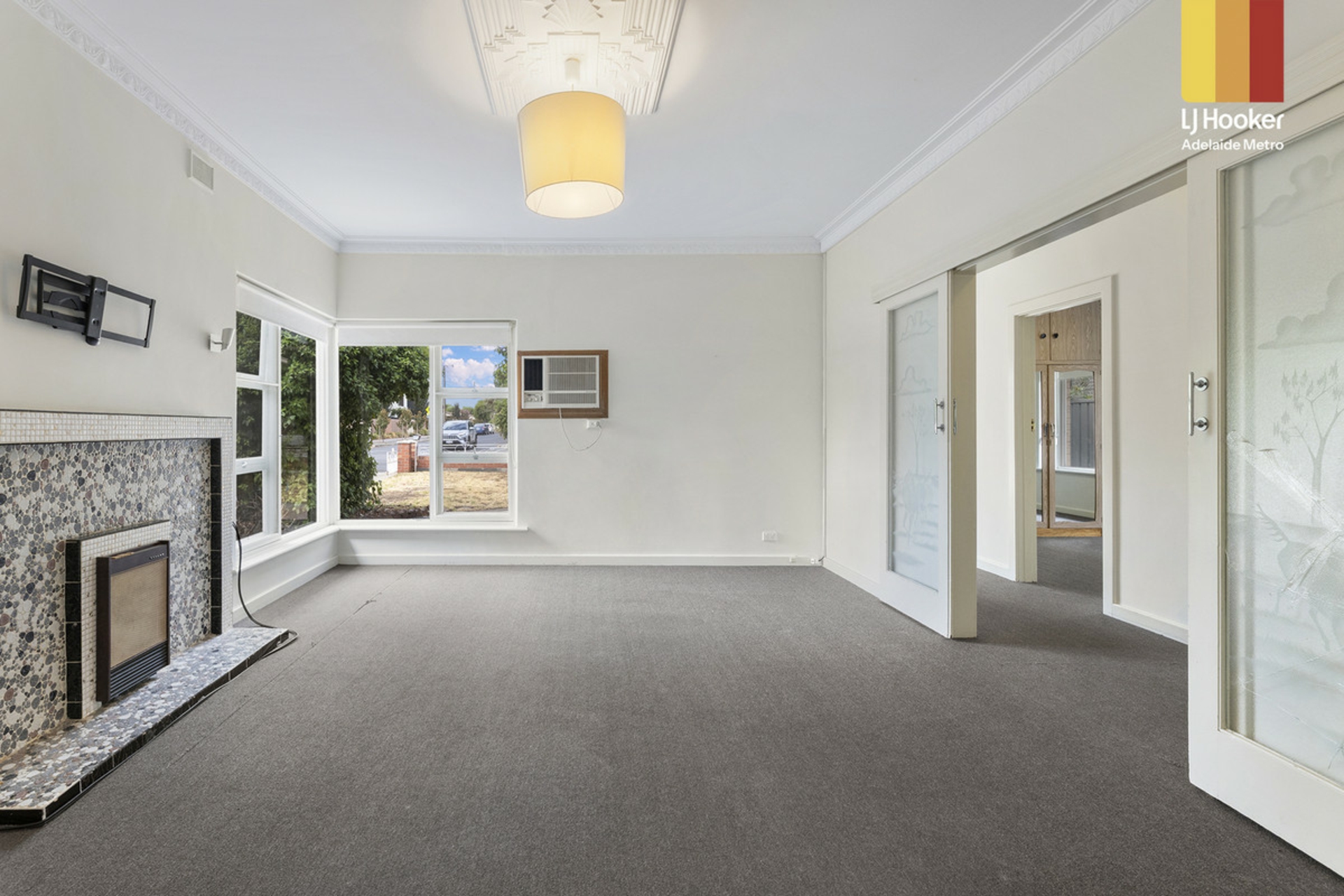 -Corner window lounge with decorative ceiling and feature fireplace