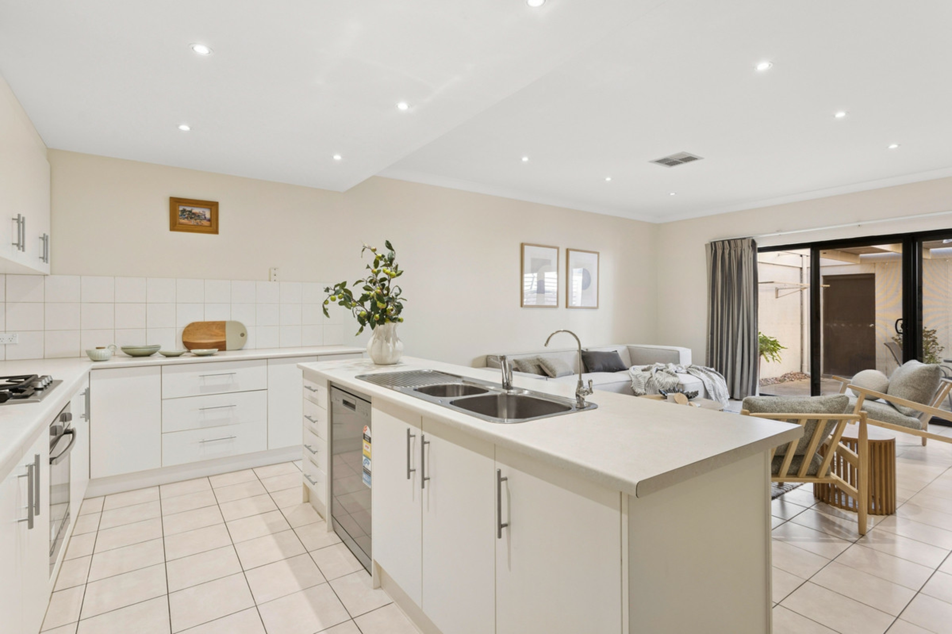 • Island kitchen with ample bench space, dishwasher, oven/gas cooktop with cupboard in pantry