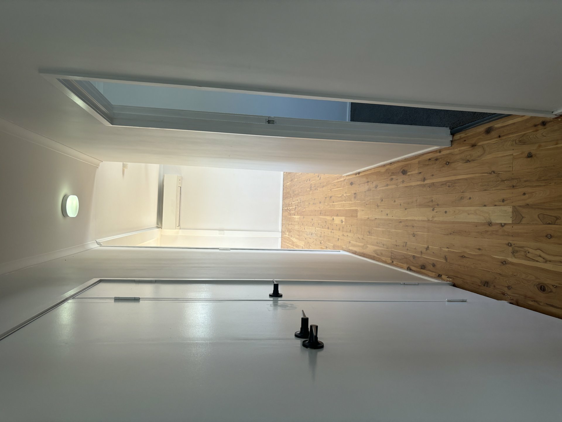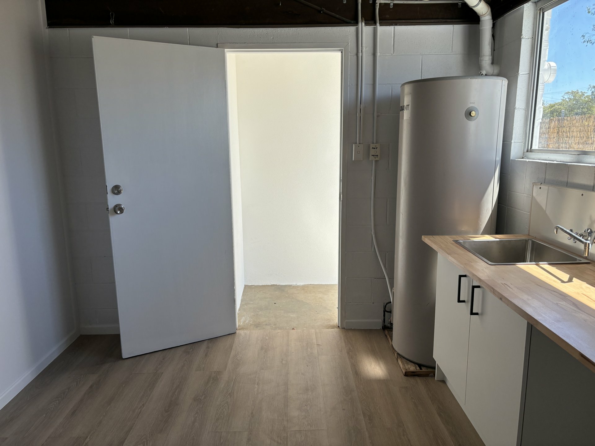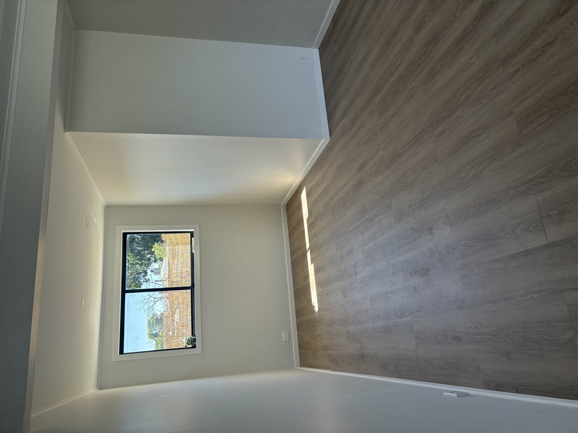 Downstairs bedroom with vinyl plank floor and split system air-conditioner.