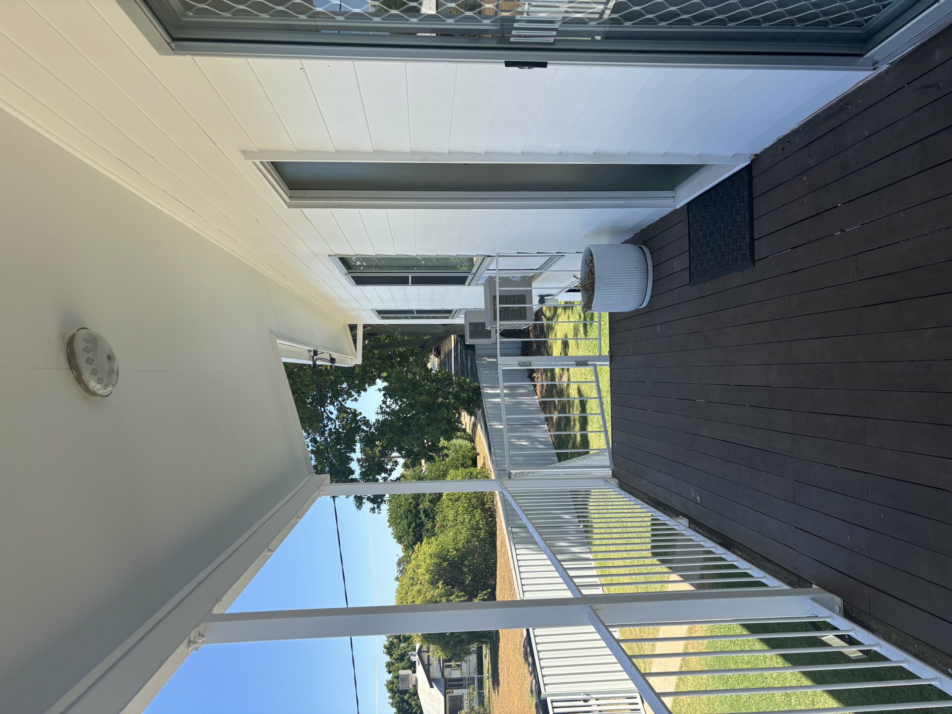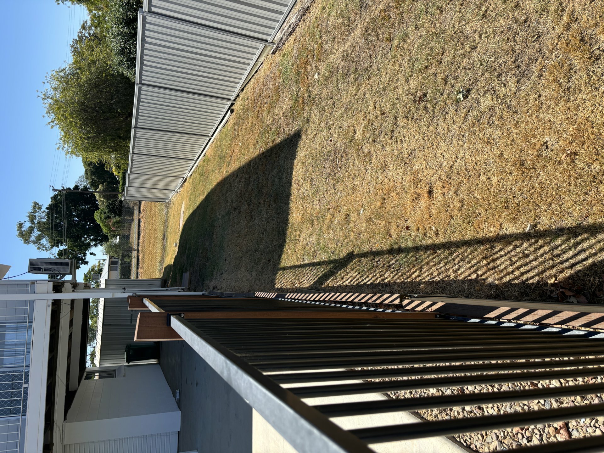 Fenced dog run and easy care lawn area in a fully fenced yard with automatic electric gate for safety and convenience.