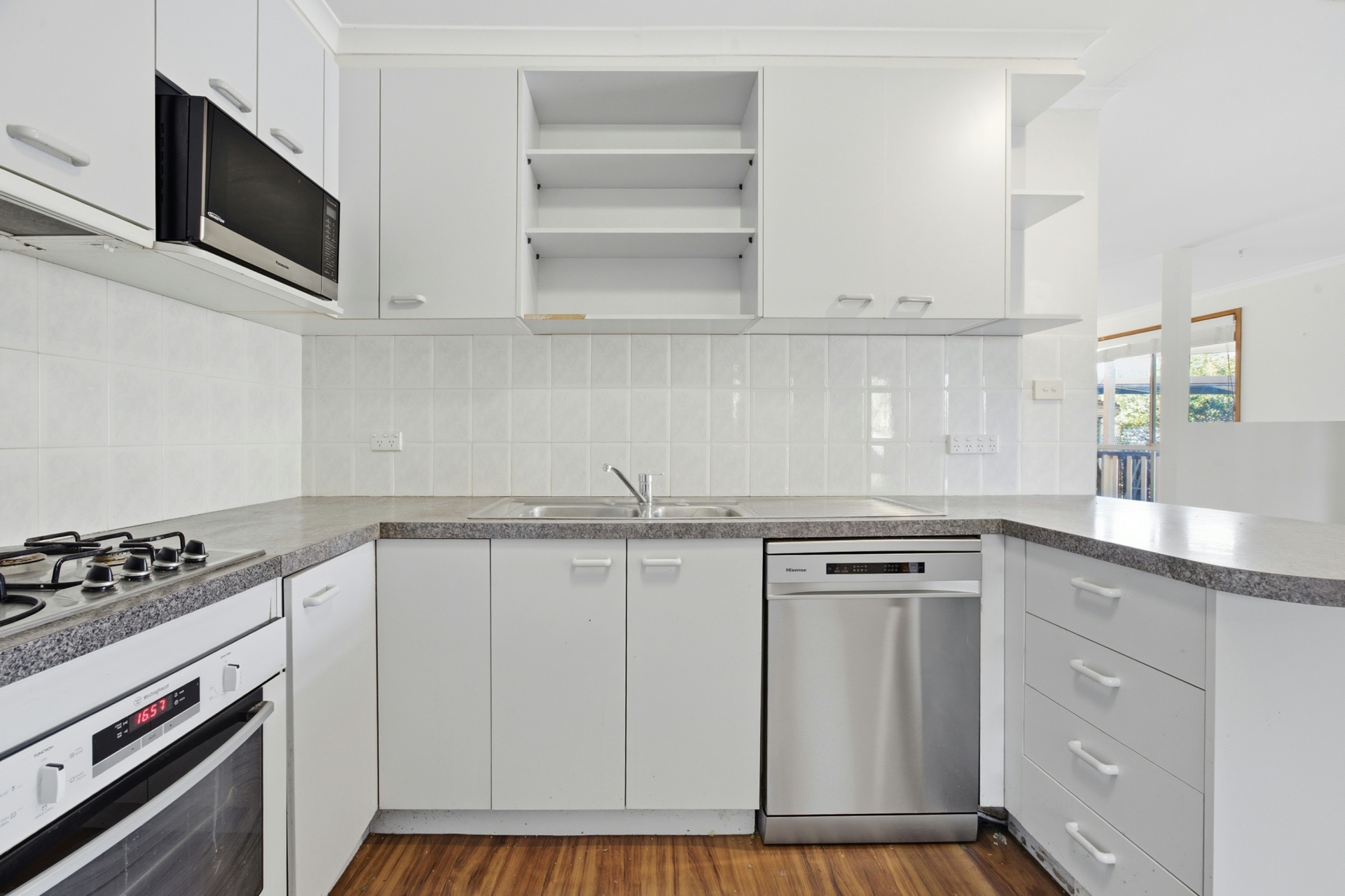 • Practical kitchen with gas cooking, dishwasher, ample storage and bench space