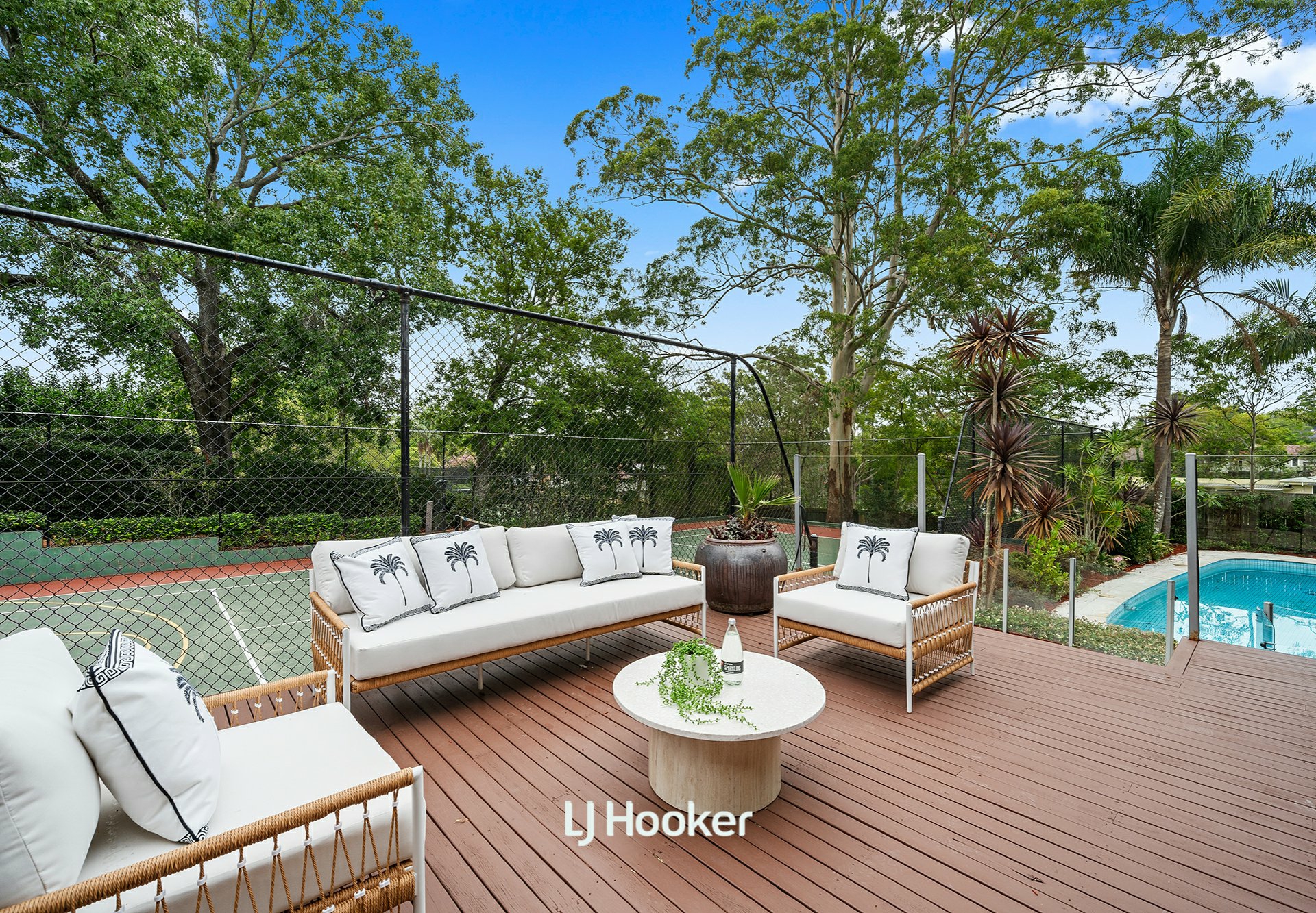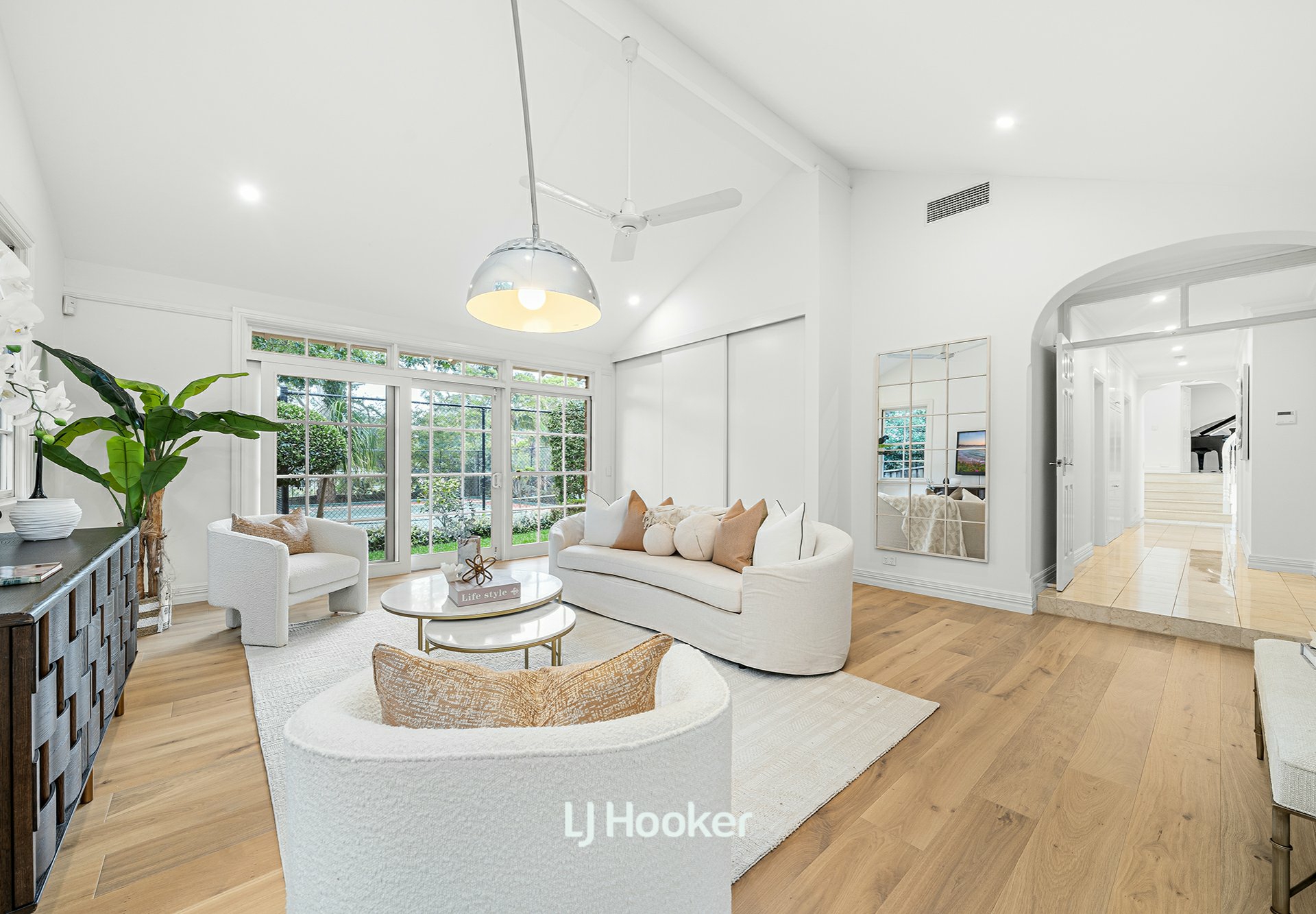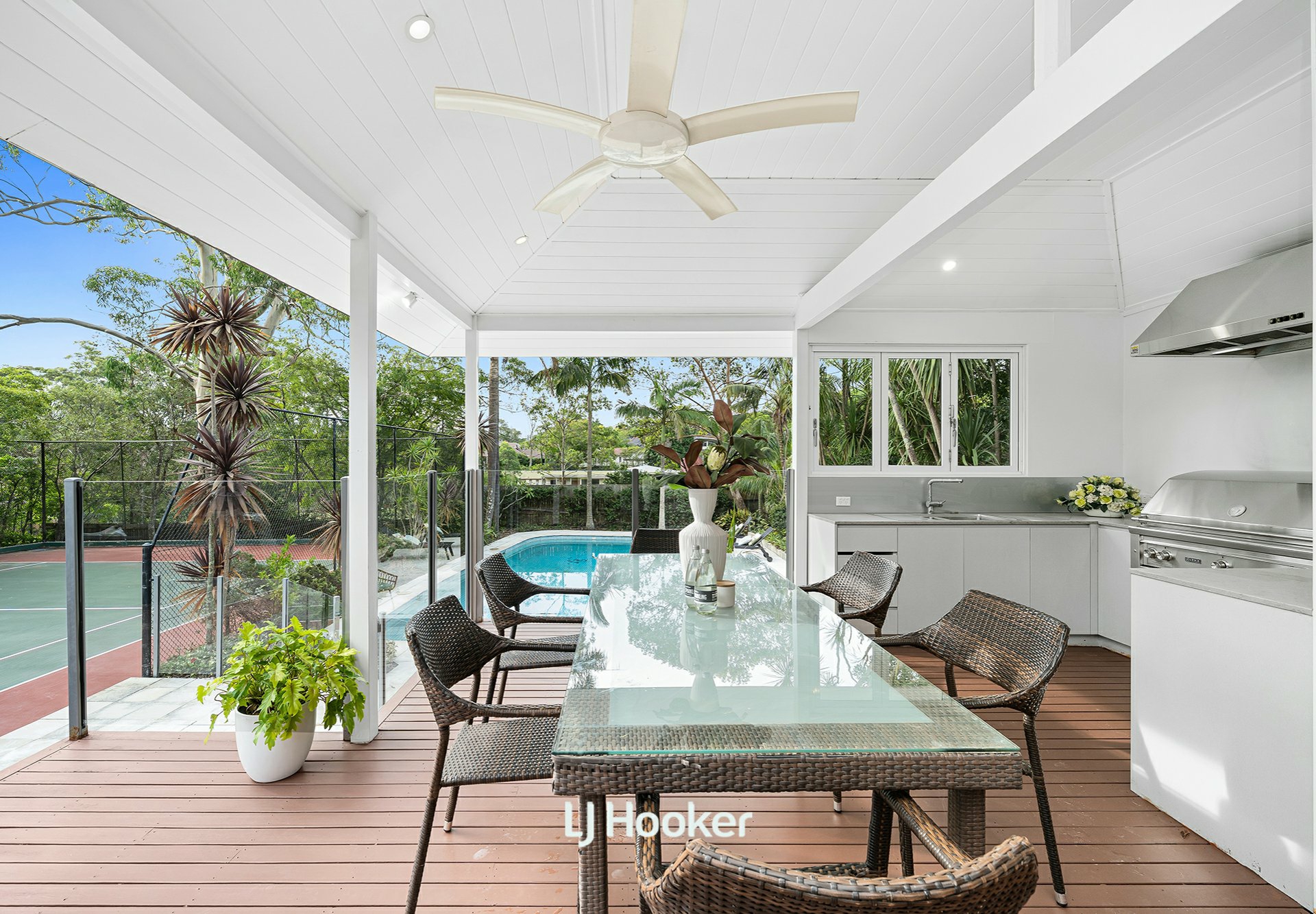 - A generous family living room with fireplace opens to alfresco terraces, in-ground pool, tennis court, garden pavilions, and covered outdoor entertaining with built-in barbeque, creating a private, resort-like setting