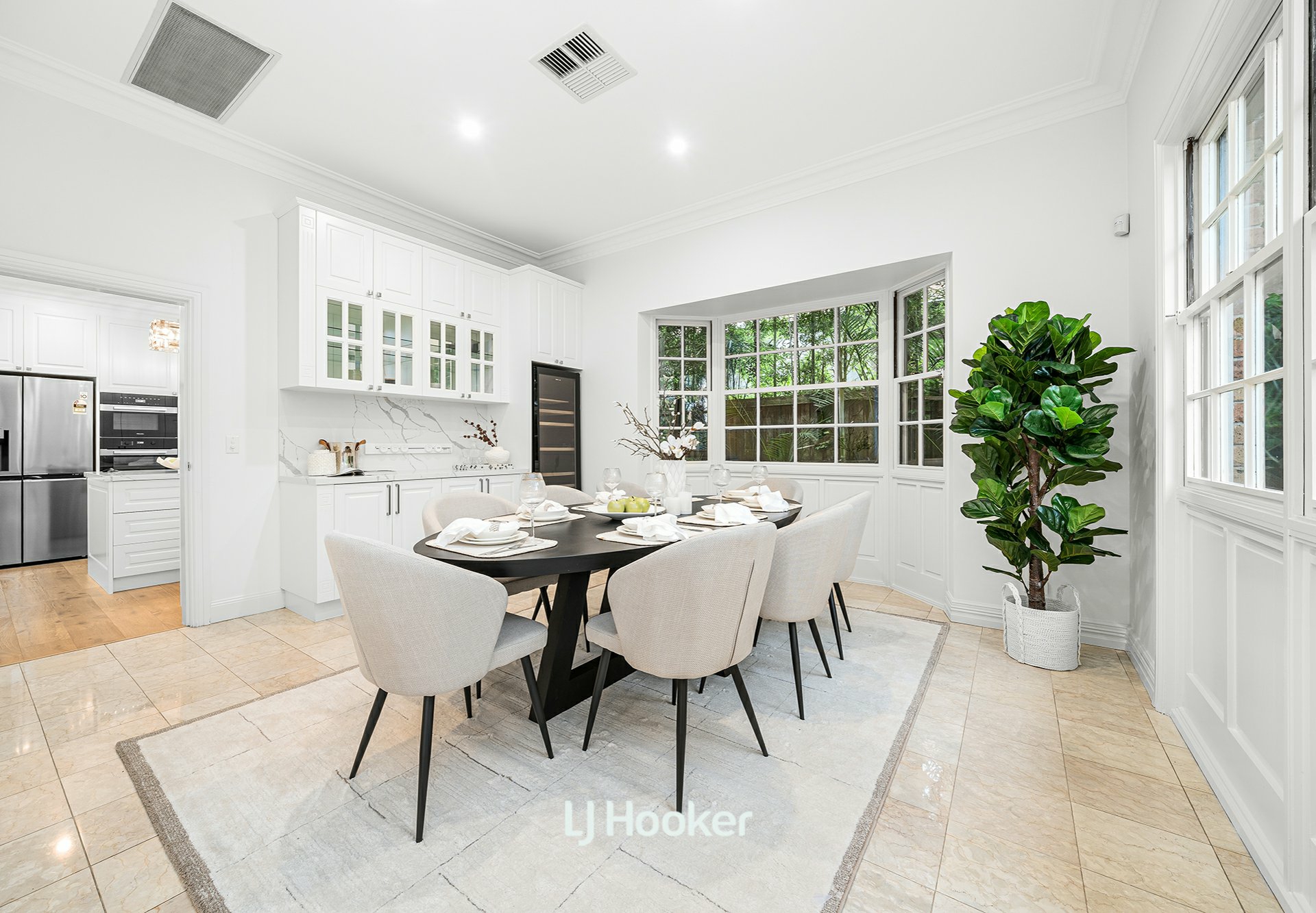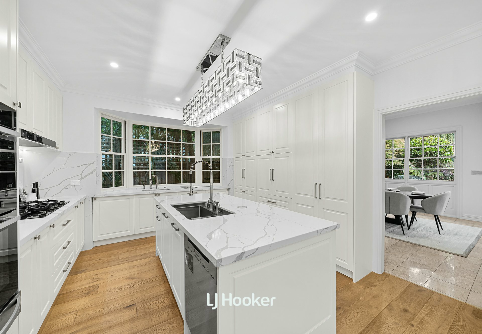 - Formal living and dining rooms, framed by garden views, flow effortlessly to the renovated grand kitchen and sunlit family dining area
