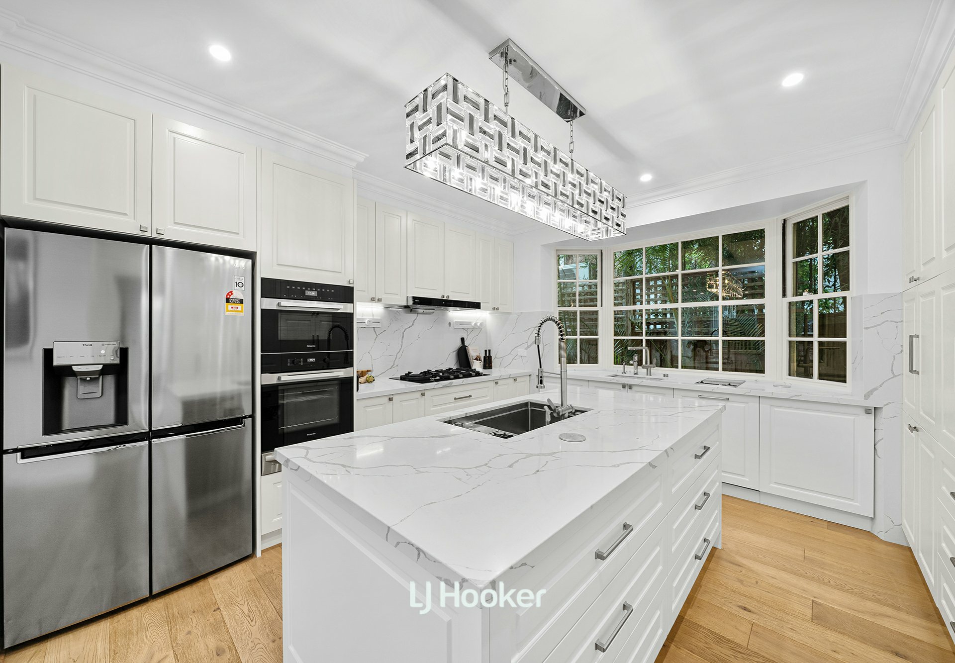 - Modern kitchen boasting high-end appliances including Miele double ovens, multifunctional sinks, gas cooktop, additional electric cooktop