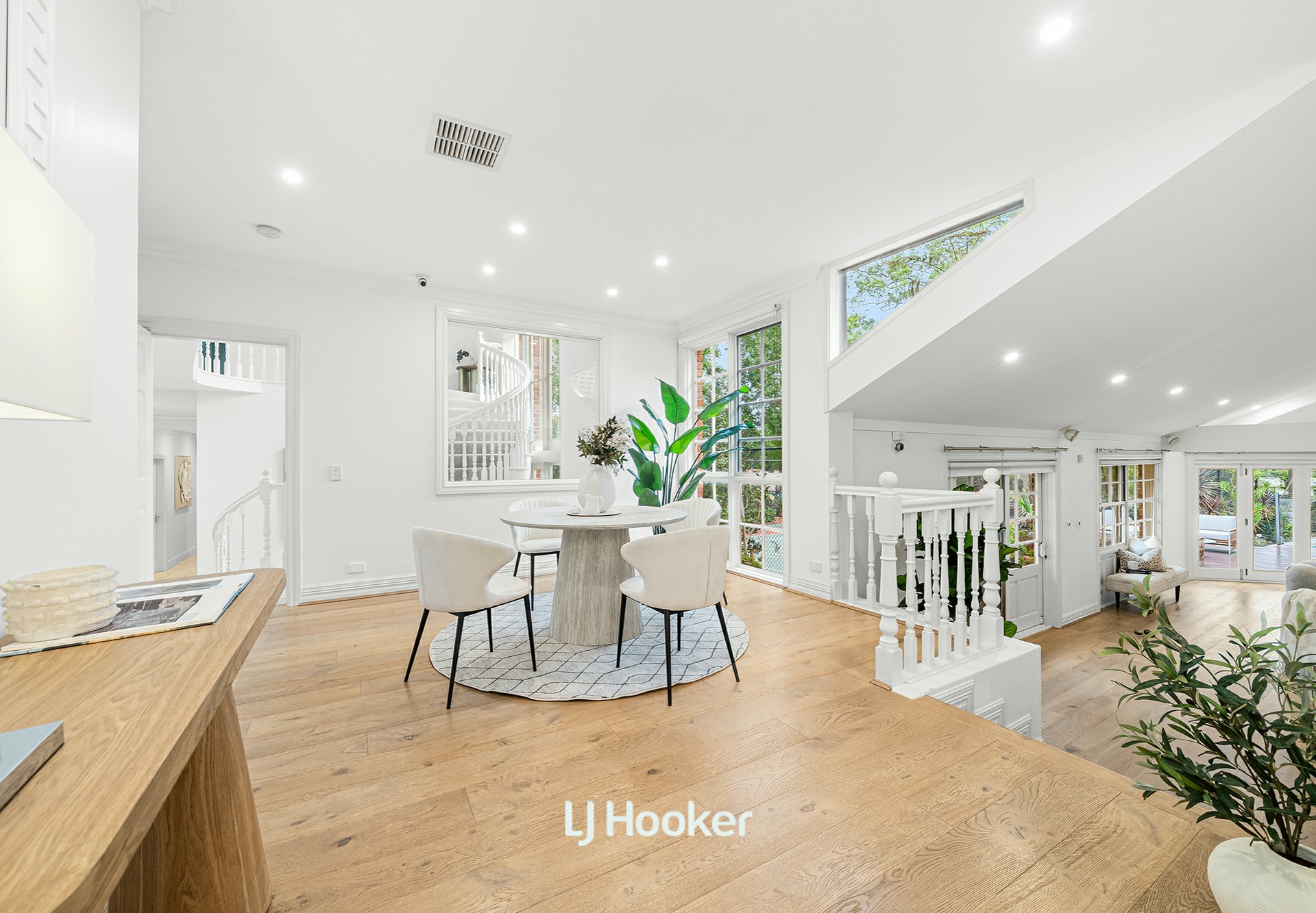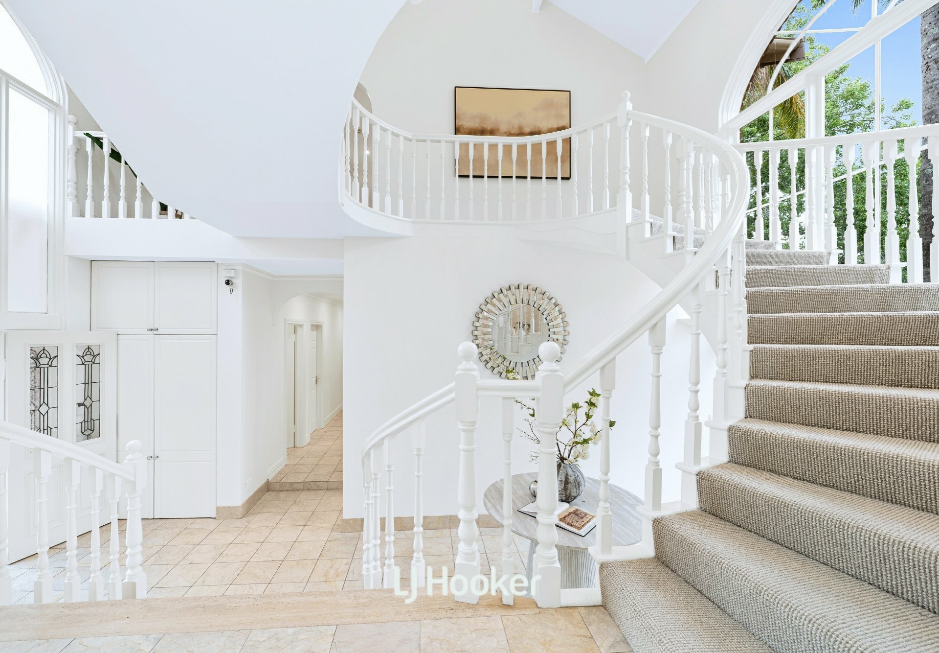 - A breath-taking circular staircase leads to a soaring central hall, drawing the eye upward and filling the home with light