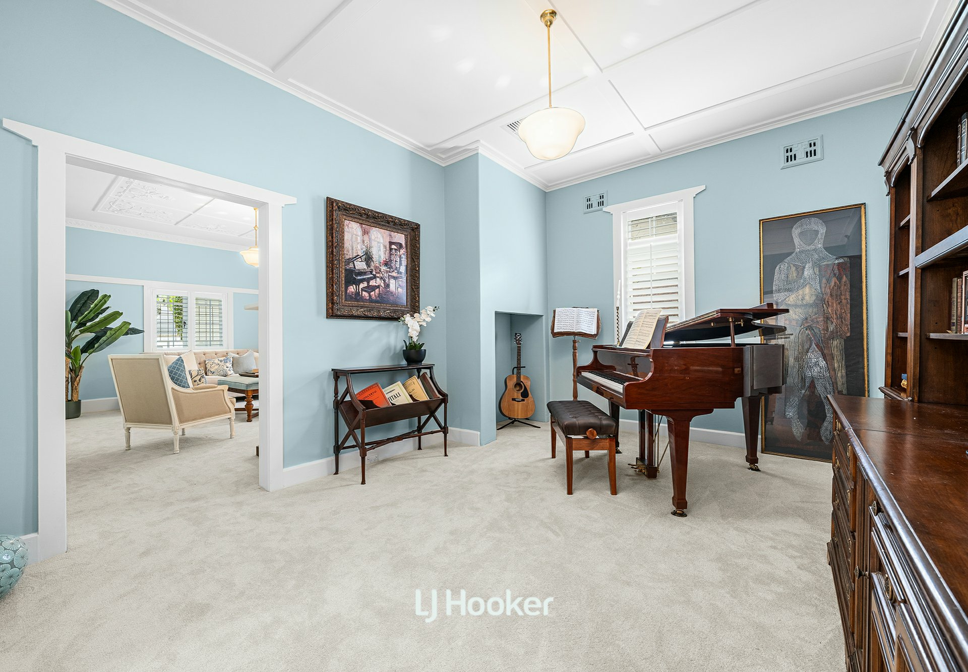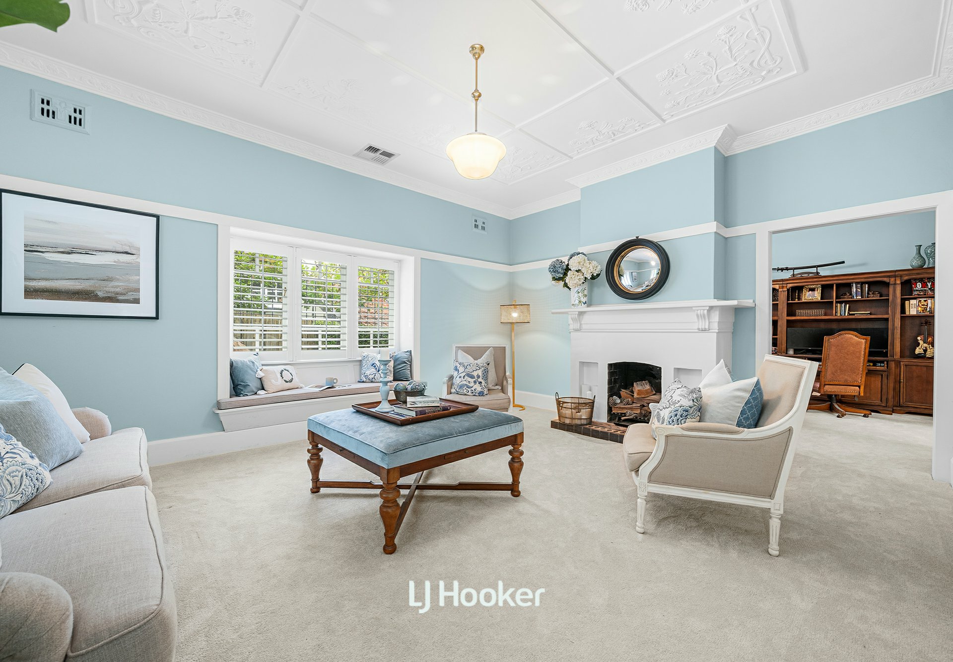 Inside, multiple formal and informal living areas unfold across two generous levels, offering exceptional flexibility for growing families. while a selection of outdoor spaces creates opportunities to unwind, entertain, or simply enjoy the peaceful garden surrounds. The formal living room is rich in character and warmth, showcasing high ornate ceilings, an open fireplace and a charming window seat that captures beautiful natural light throughout the day.