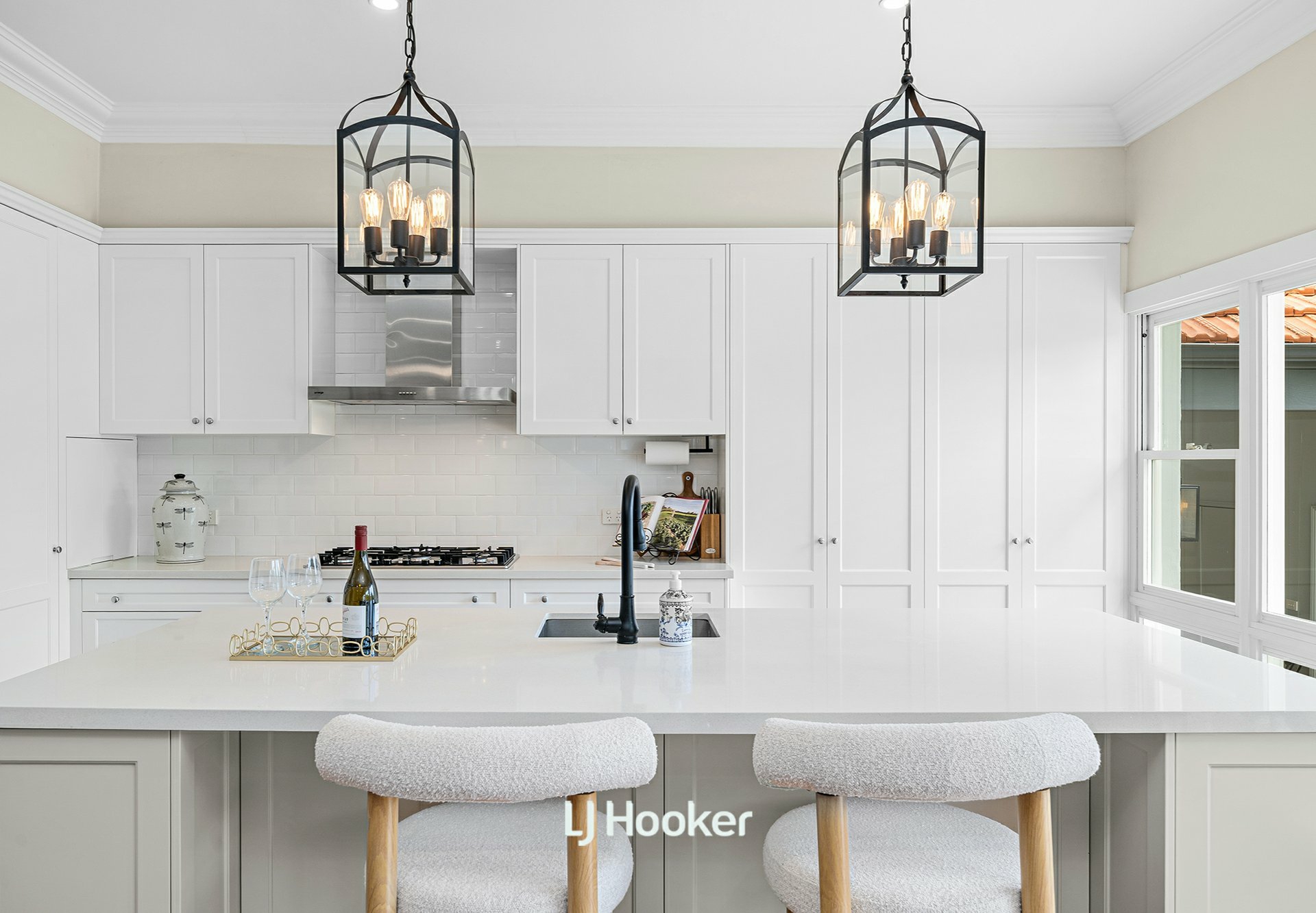 The heart of the home is the stunning shaker-style kitchen, thoughtfully appointed with stone benchtops, double ovens and a striking 2.8-metre island, seamlessly connecting to expansive family and dining areas. These spaces extend effortlessly to the exterior living space, complete with travertine flooring and an automated louvred roof, allowing complete control over sunlight and weather for year-round entertaining.