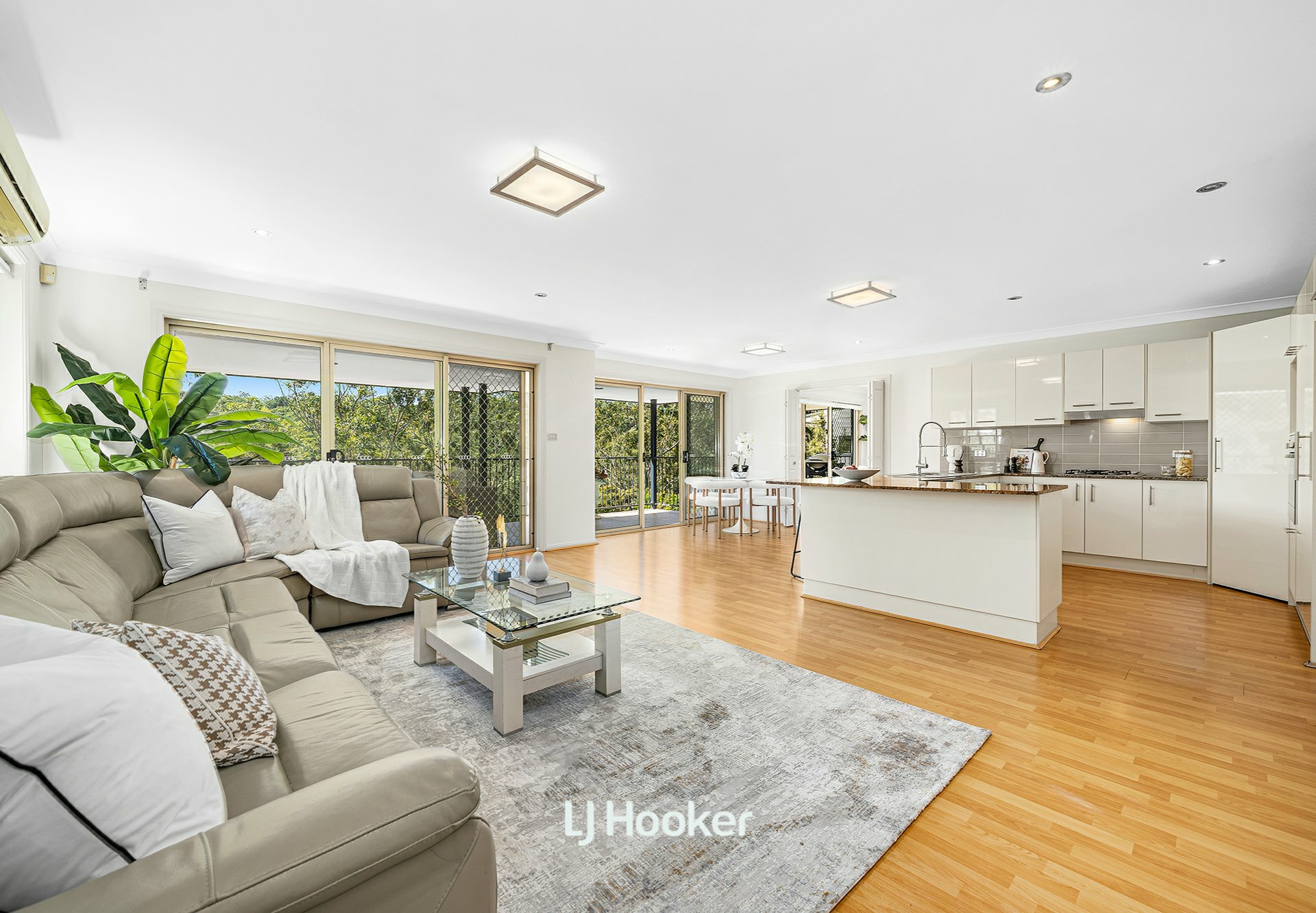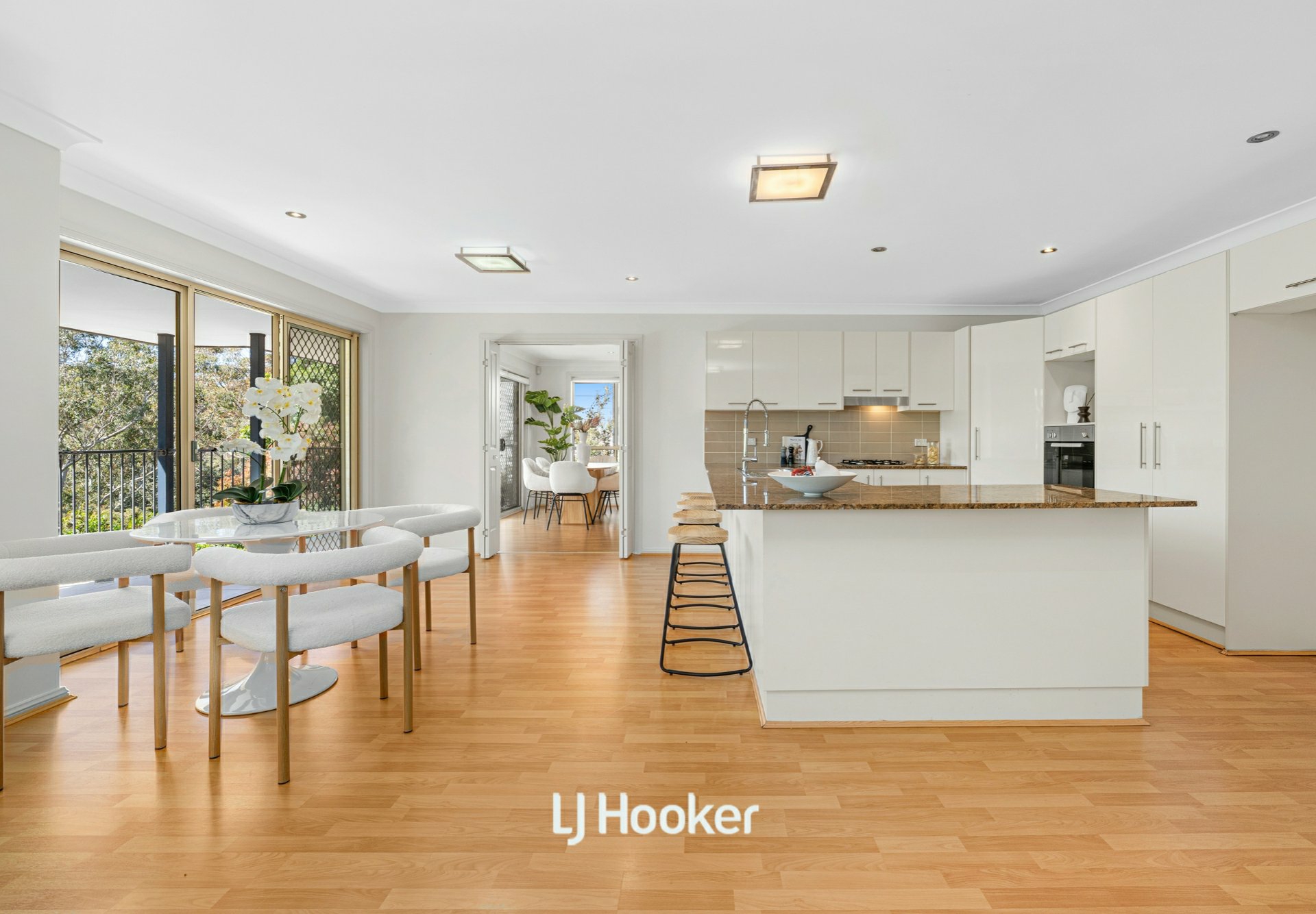 - The spacious kitchen includes storage, large benchtops, and a breakfast bar opening to an elevated balcony