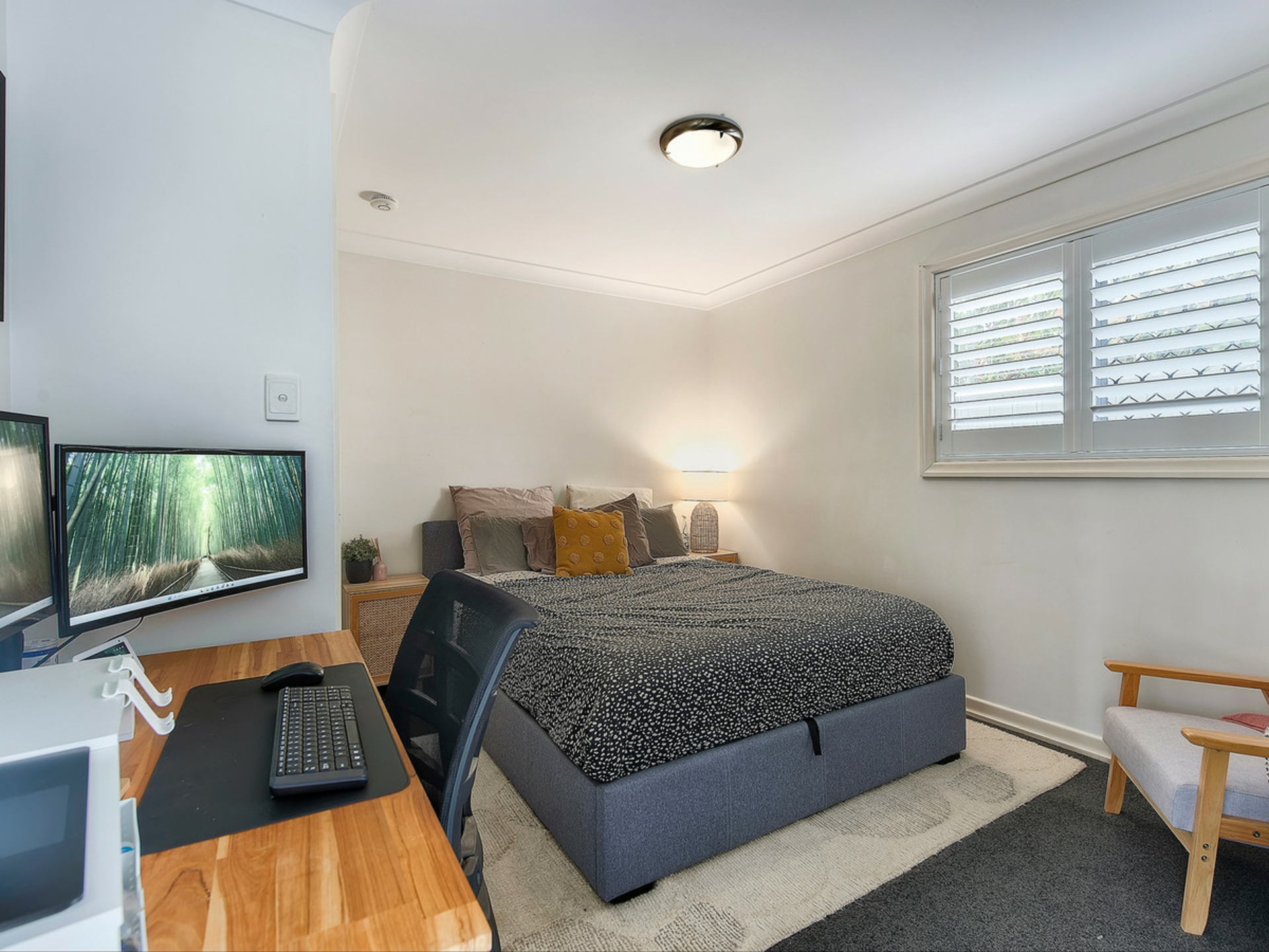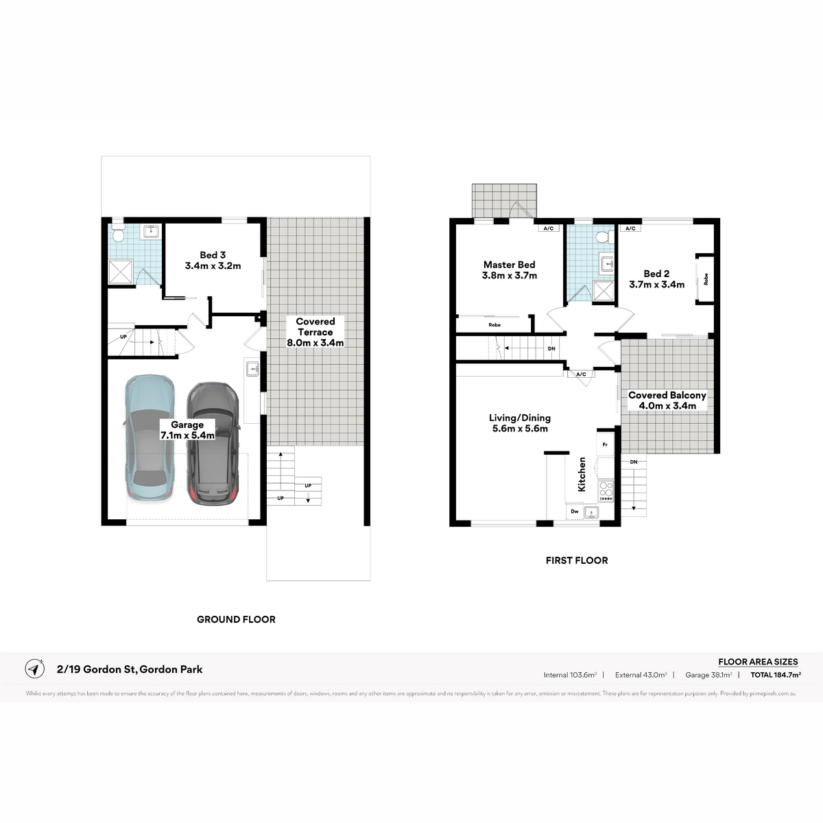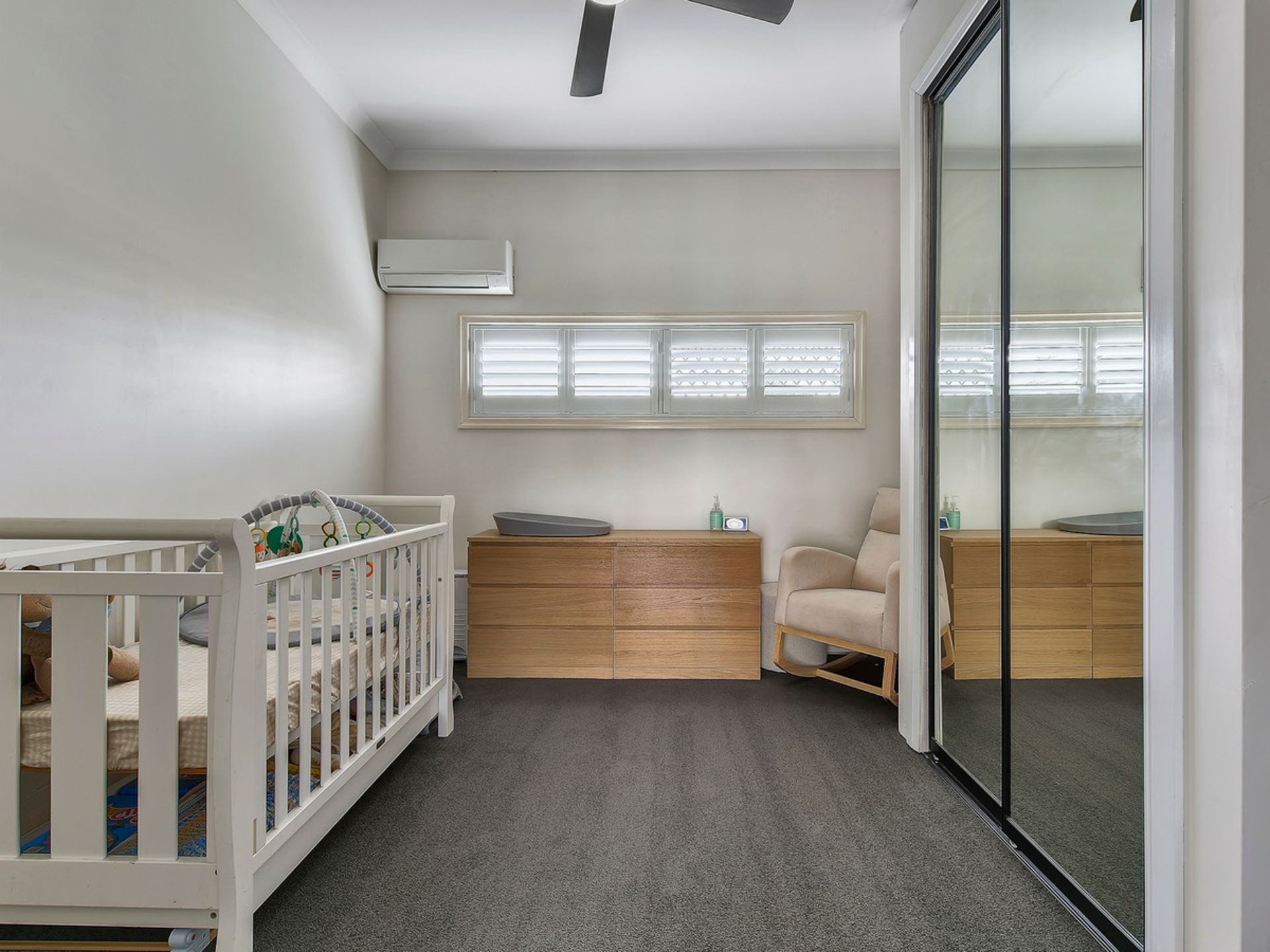Upstairs, two generous air-conditioned bedrooms are filled with natural light and include built-in robes and ceiling fans. The master bedroom enjoys its own private balcony, while a modern bathroom services the level.
