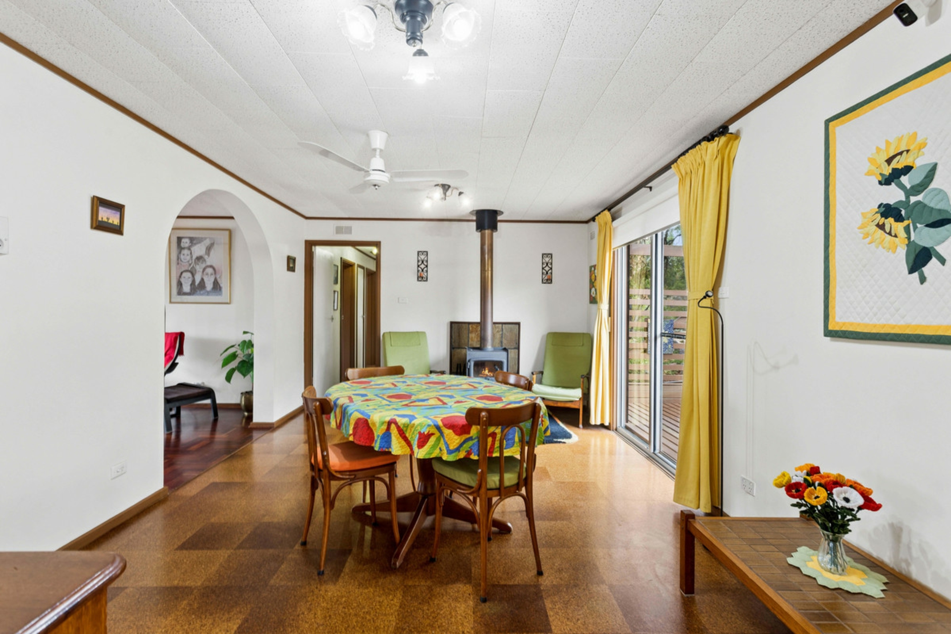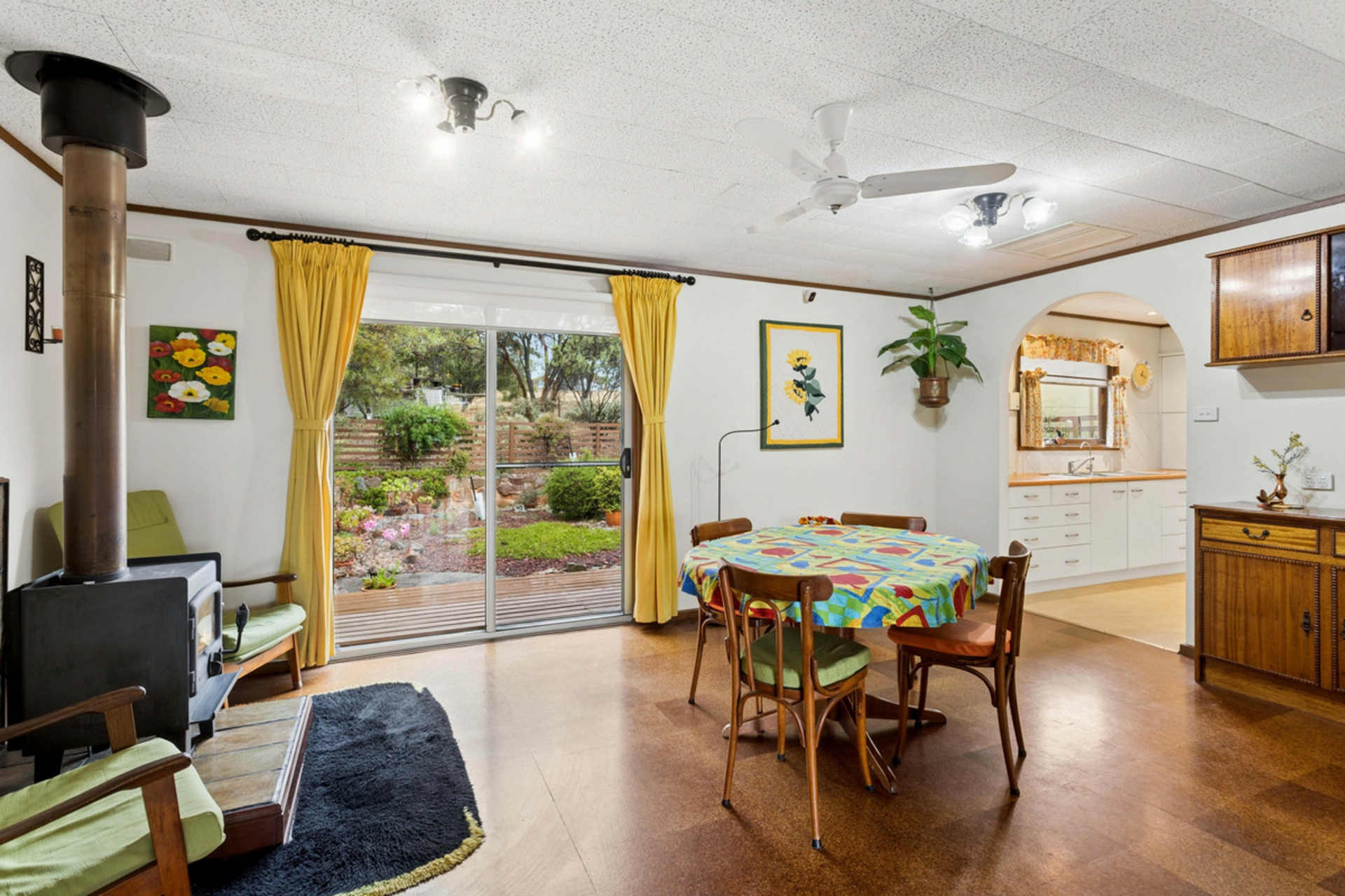 A well-appointed kitchen offers ample cupboard space and flows seamlessly into the open plan dining area, complete with a cosy wood fire heater, perfect for those cooler evenings.
