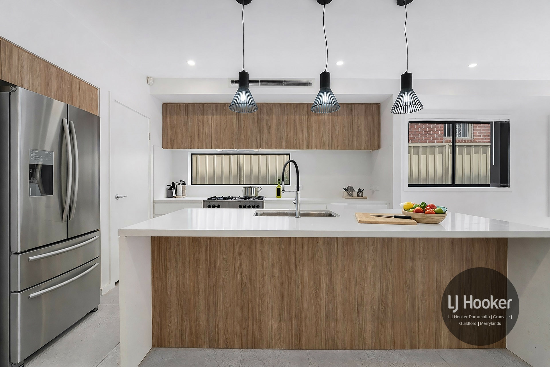 • Gas kitchen with stone benchtops and stainless steel appliances