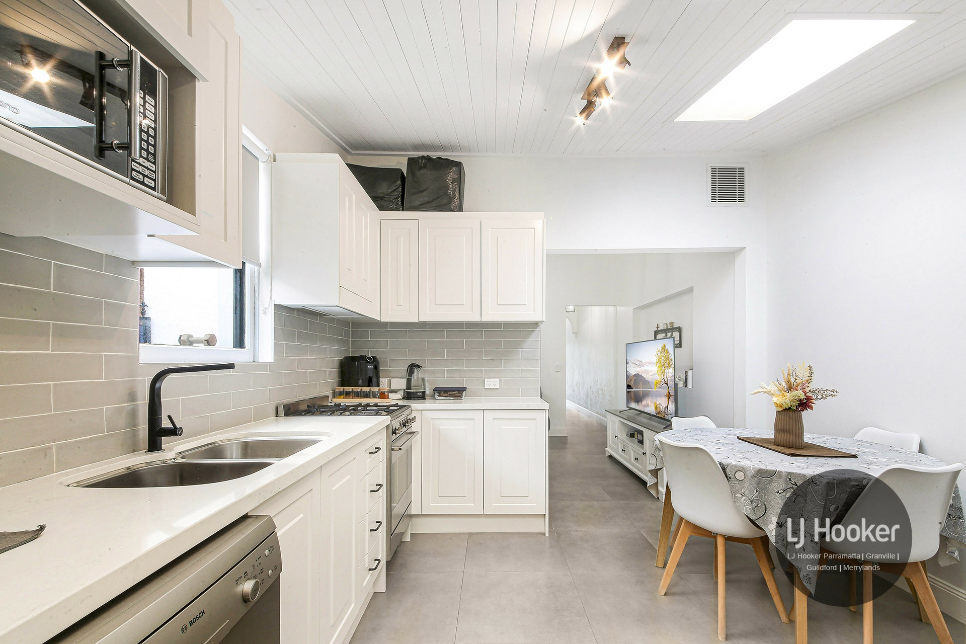 • Modern gas kitchen with stone benchtops, stainless steel appliances, and combined dining area under a second skylight