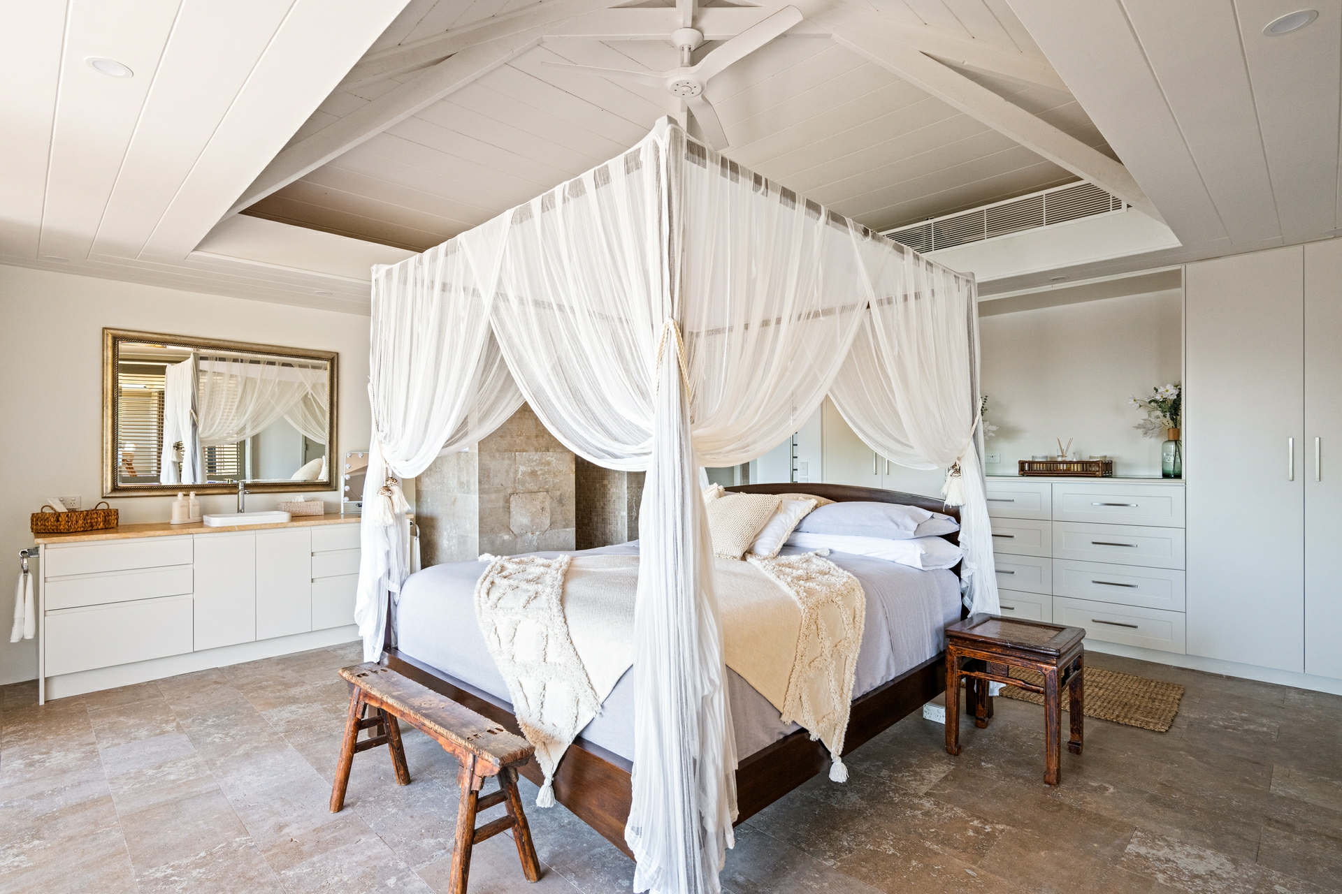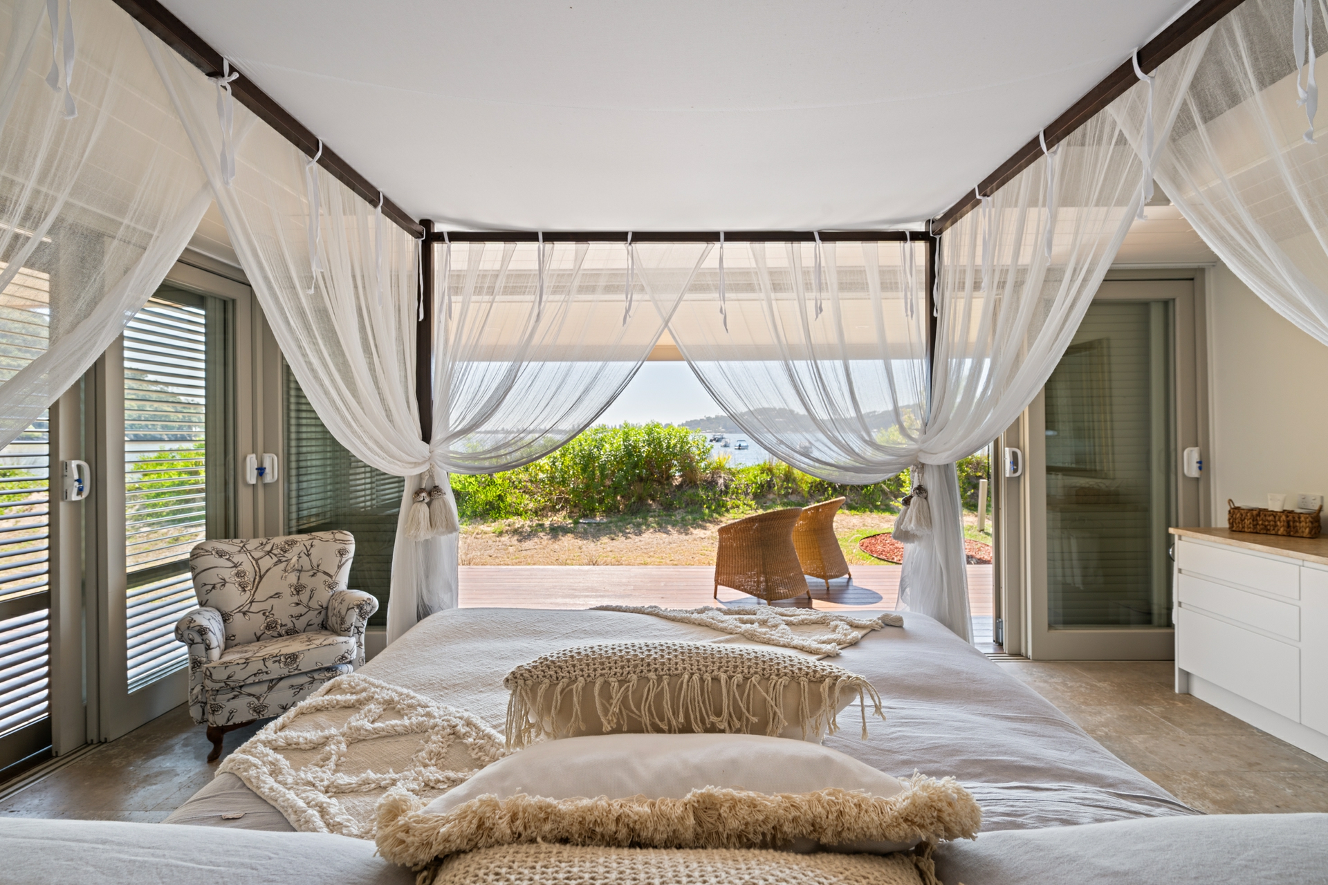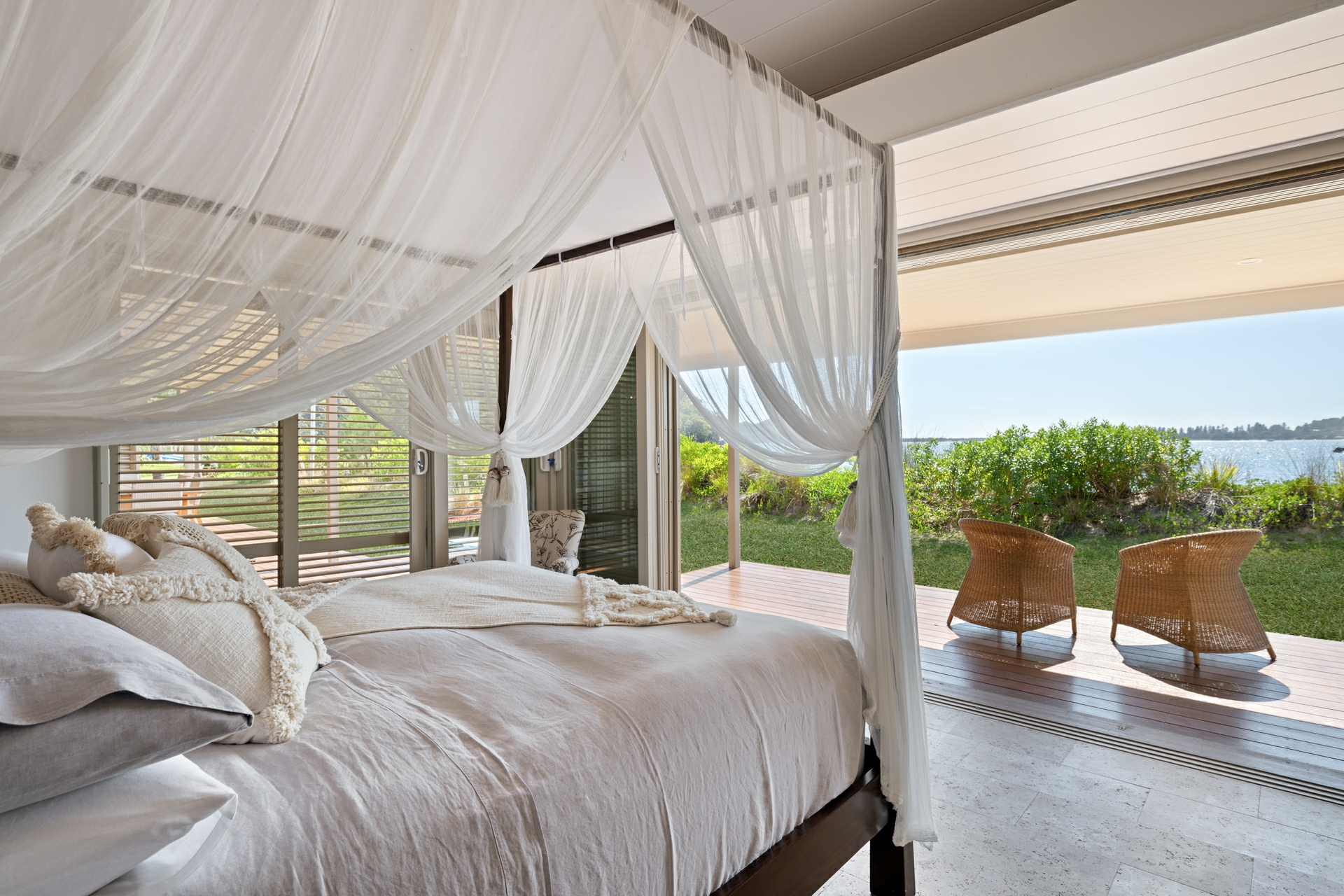 - Indulgent master retreat offering sublime privacy, captivating water views and direct access to a private deck just steps from the sand