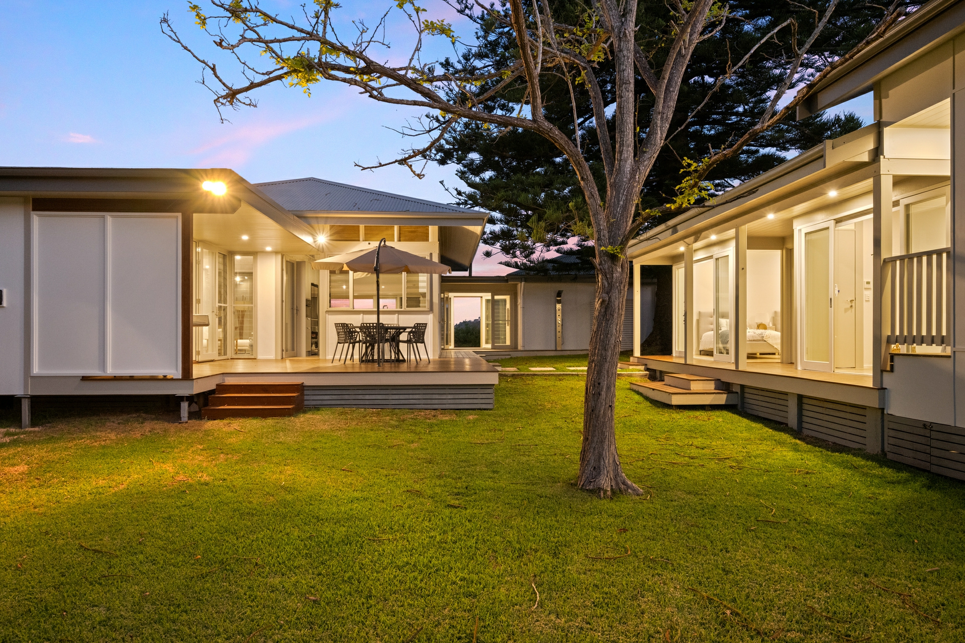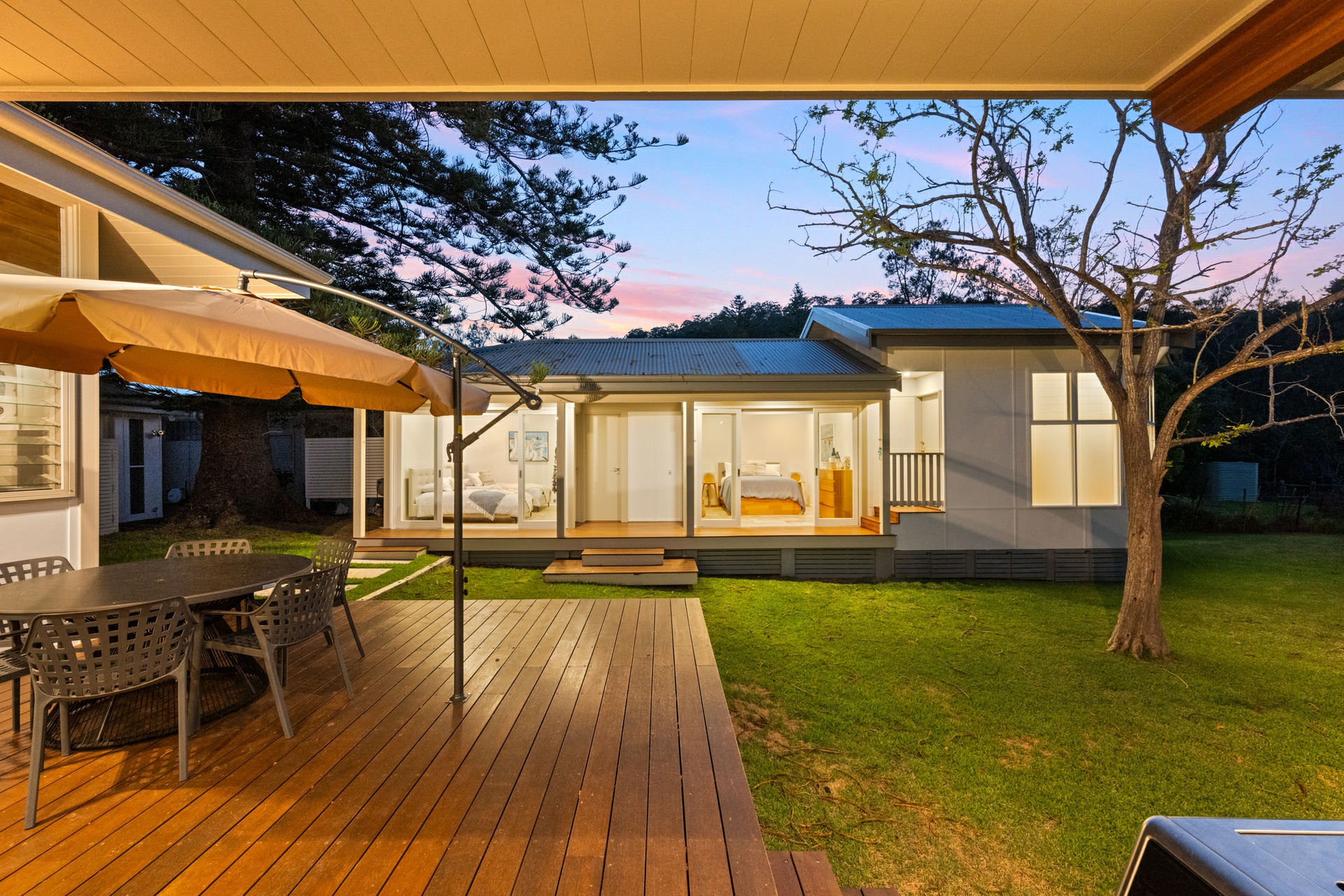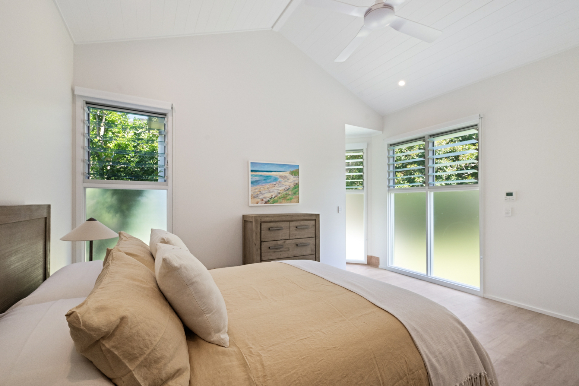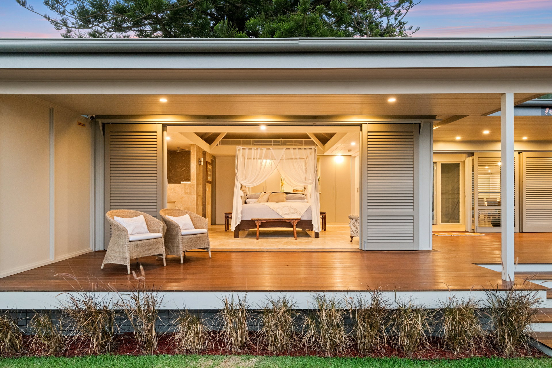 - Separate three-bedroom pavilion at the rear of the main residence with a unique bushland outlook and cooled by coastal breezes. Within this pavilion two spacious bedrooms with BIRs share a beautifully appointed, earthy-toned bathroom. A third oversized bedroom with BIRs and its own ensuite is privately positioned at the end of the deck, creating separation and seclusion