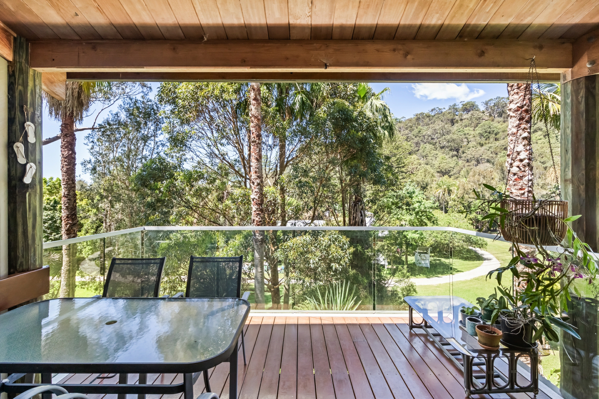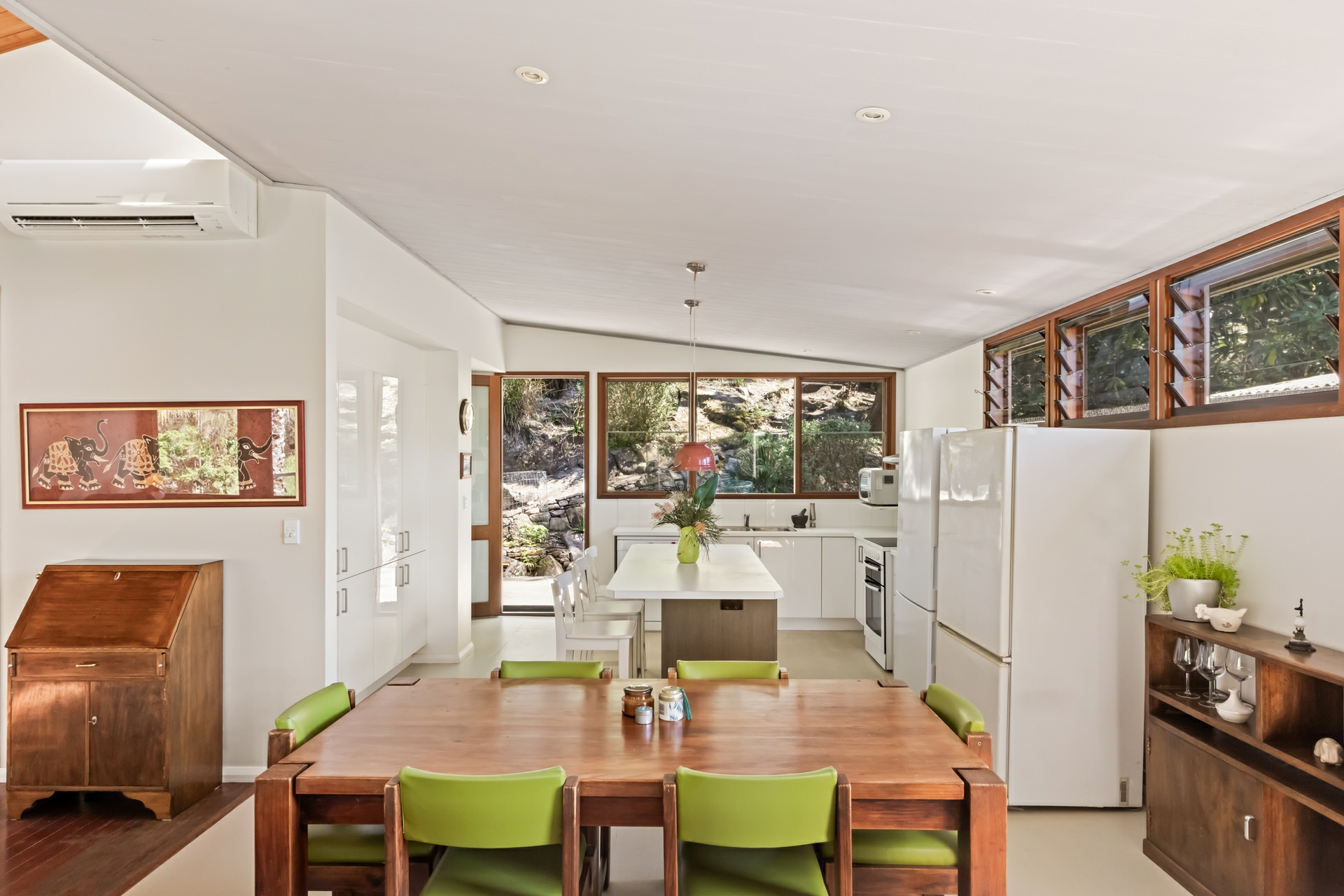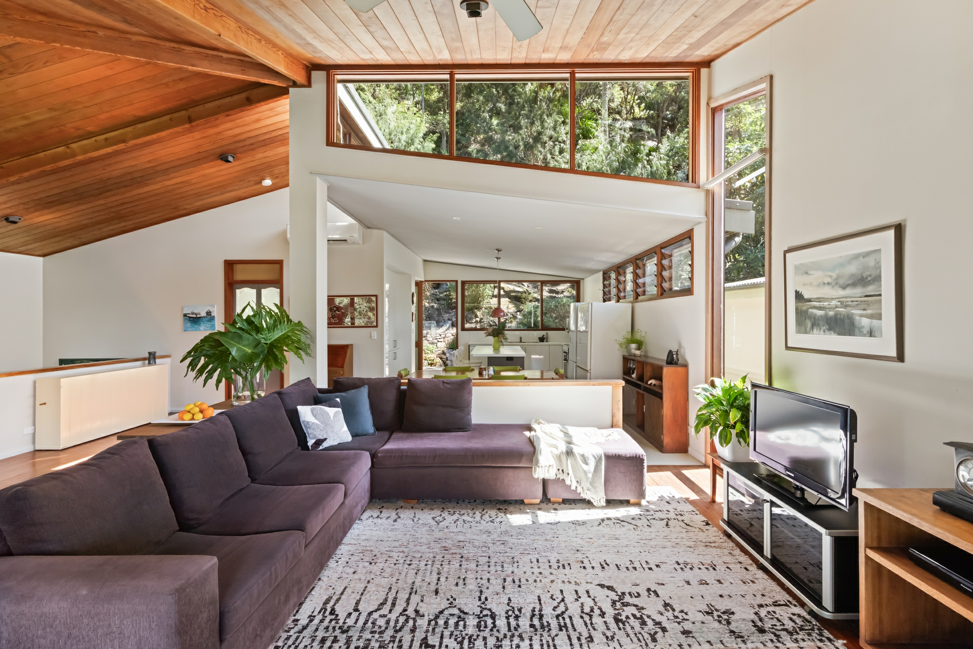 - Interiors merge with sheltered entertaining deck overlooking lush greenery