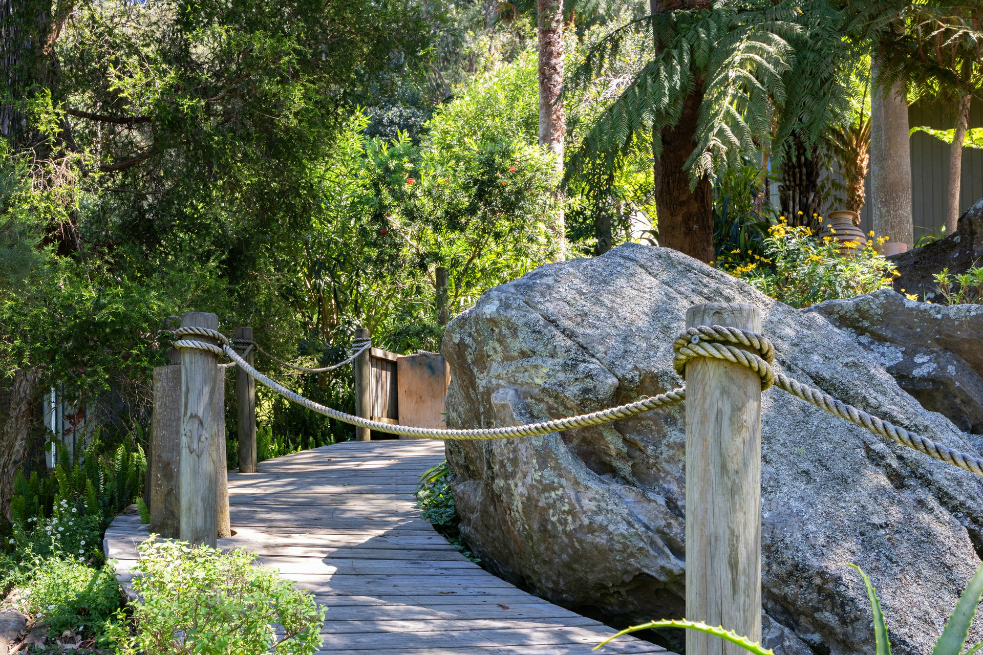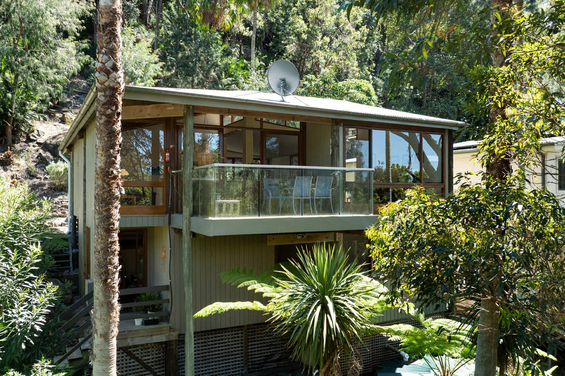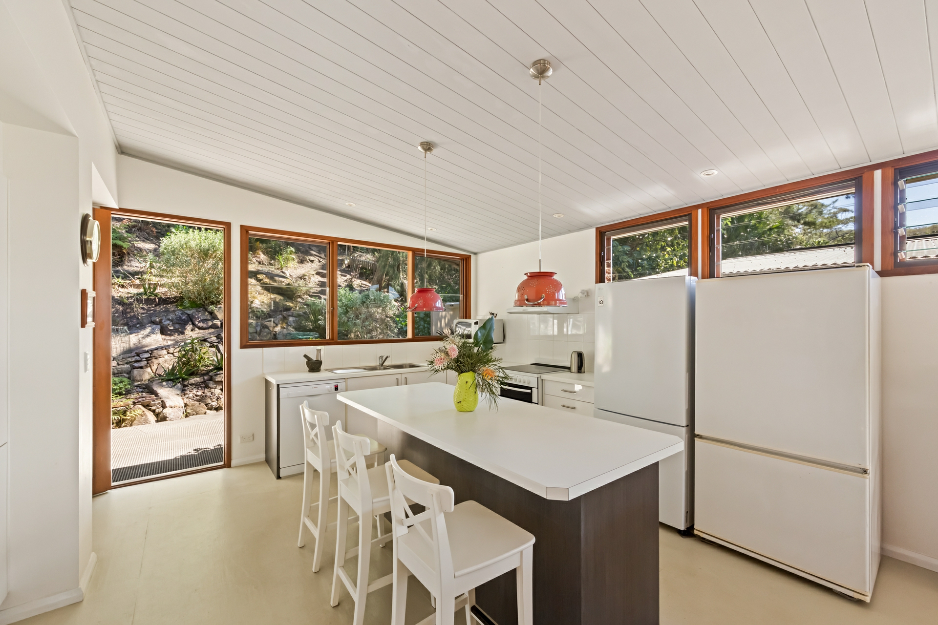 - Interiors merge with sheltered entertaining deck overlooking lush greenery