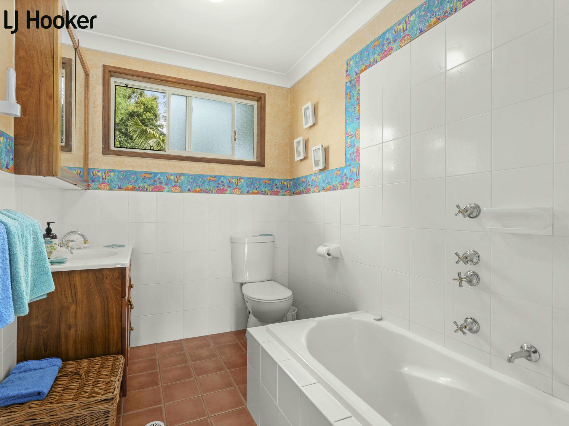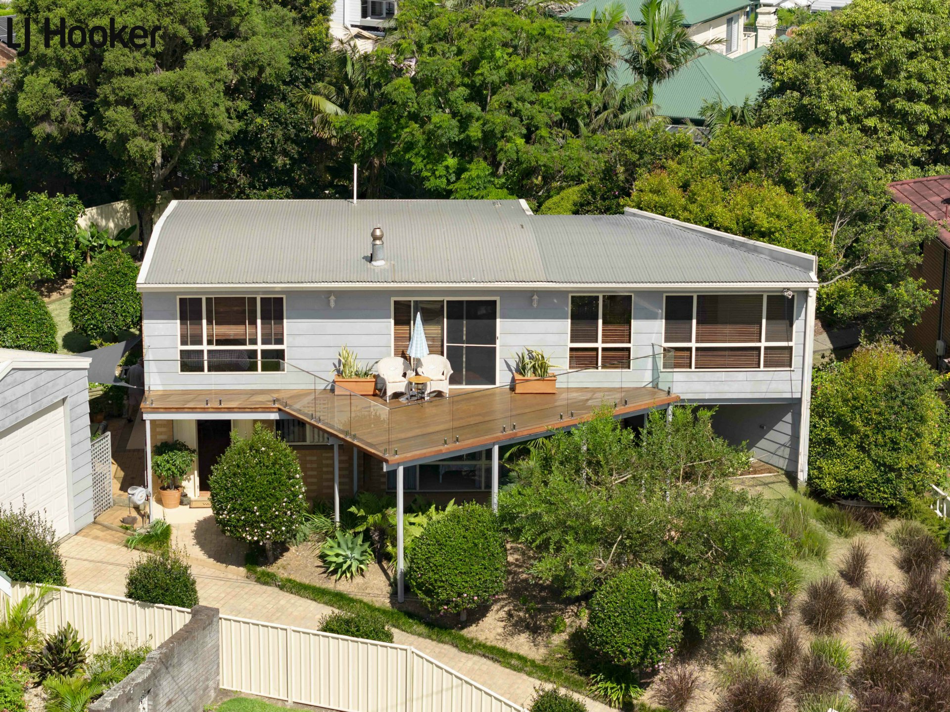 A smaller rear deck with external stairs overlooks the established garden, featuring citrus trees, a banana tree an avocado tree and even a Pineapple plant adding a touch of charm and practicality.