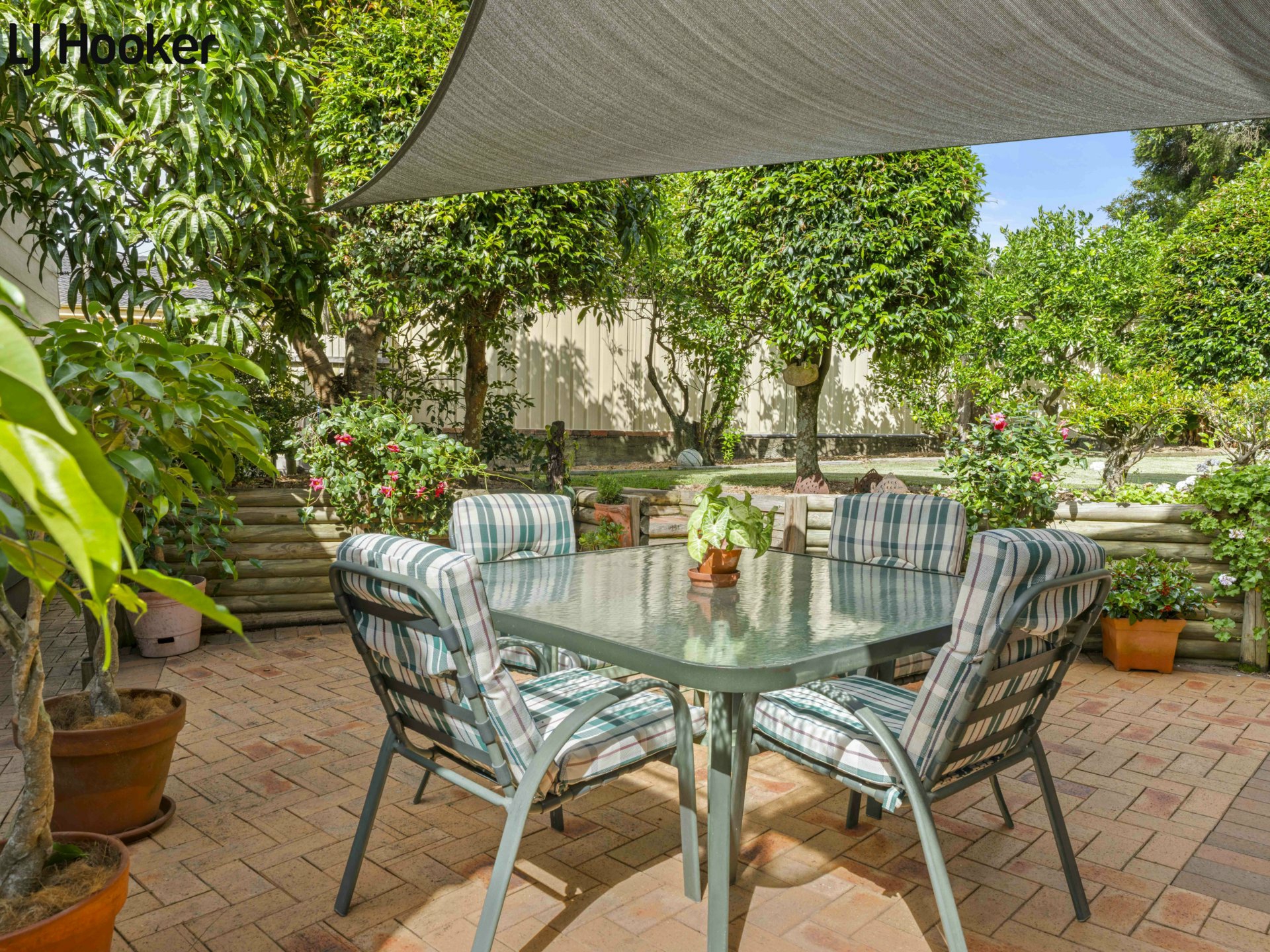 • Rear deck overlooking established garden with fruit trees