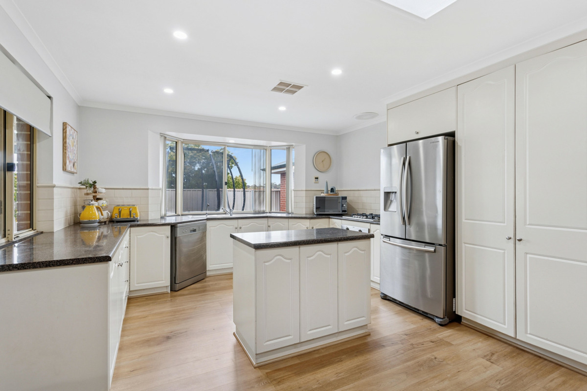 •Central kitchen with breakfast bar, dishwasher, gas cooktop, large fridge cavity with ample storage and bench space