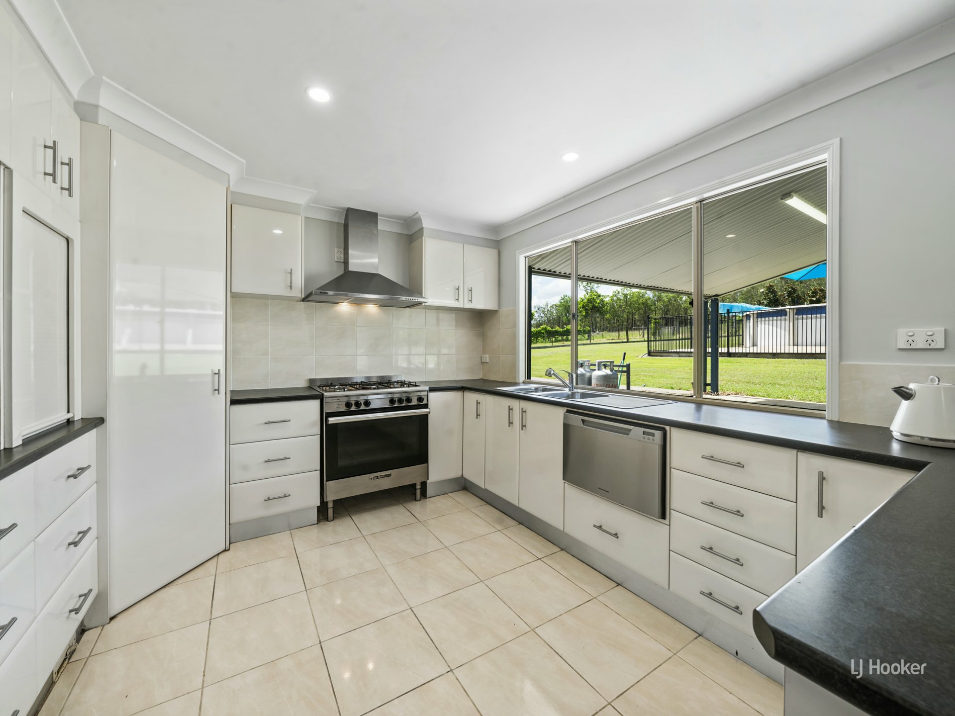 Kitchen has corner pantry, 5 burner gas stove, double fridge space, dishwasher, and plenty of draw storage.