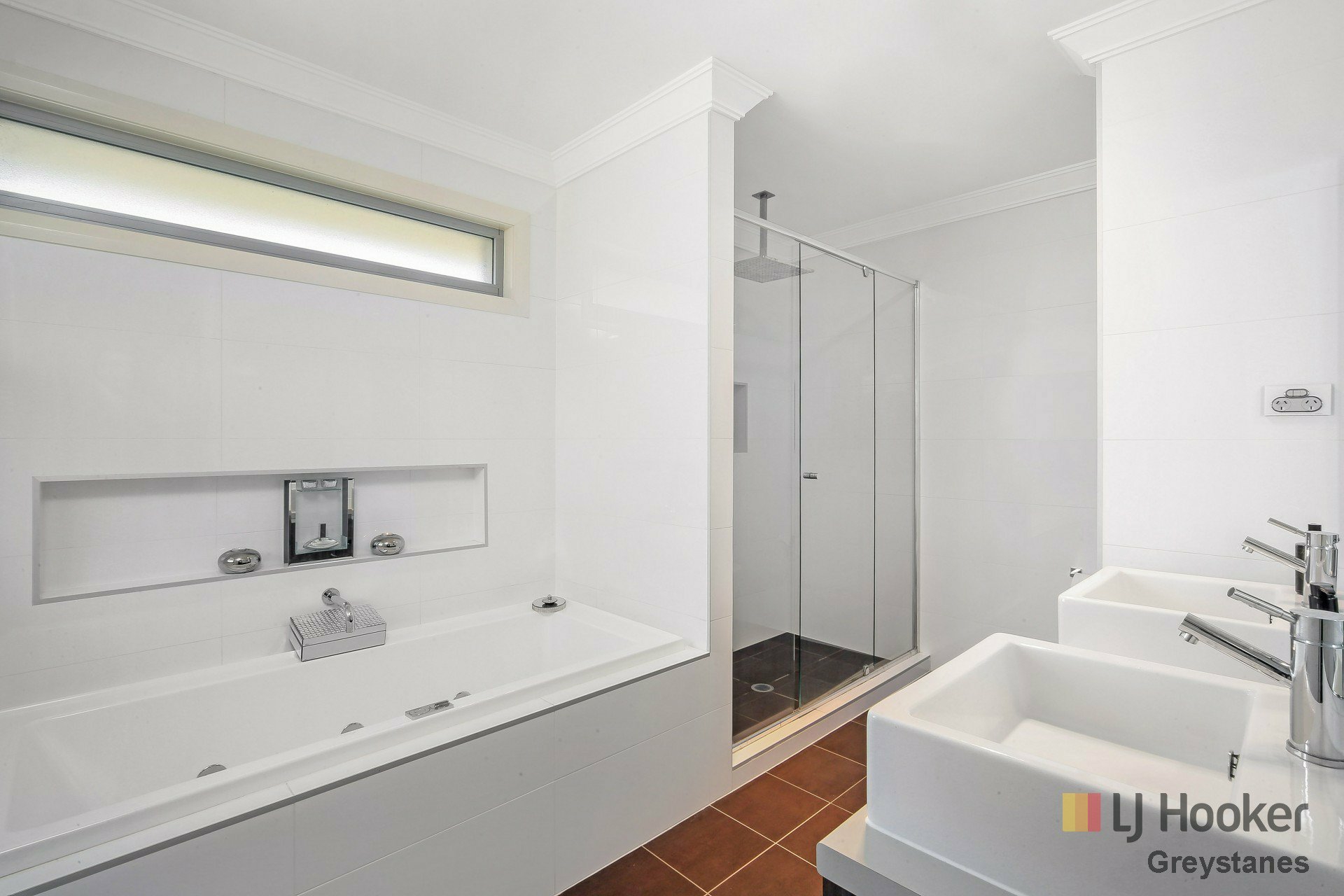 • Ensuite in primary bedroom featuring spa bath, shower, toilet and his and hers sinks