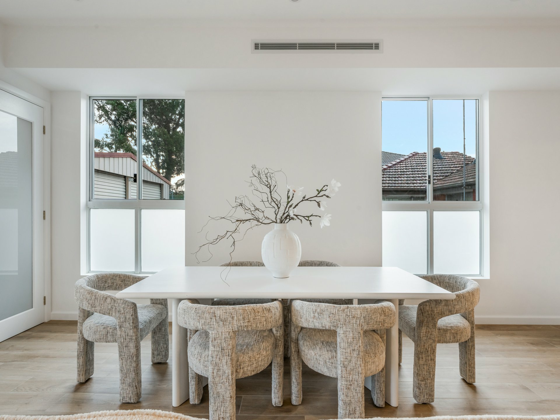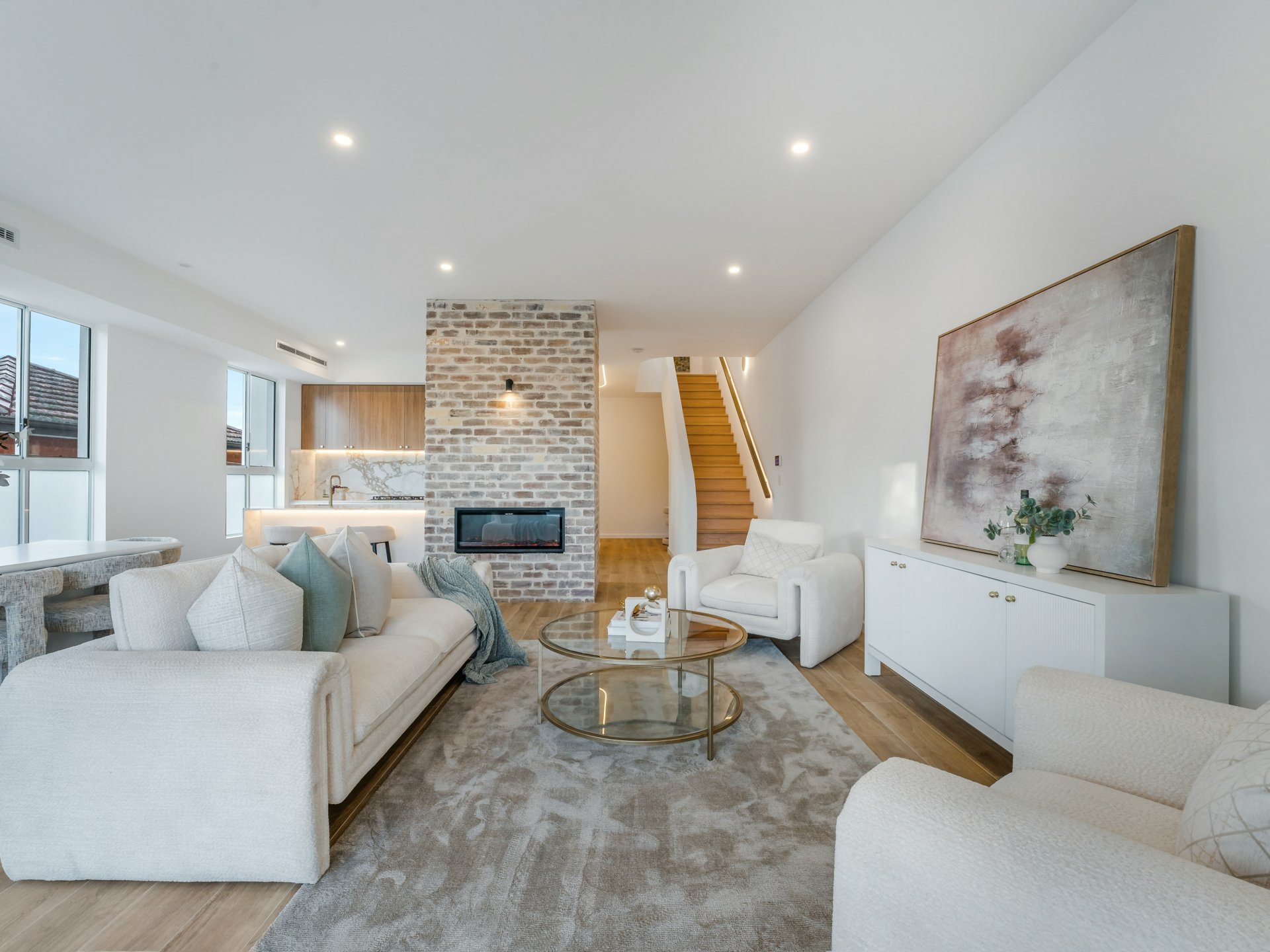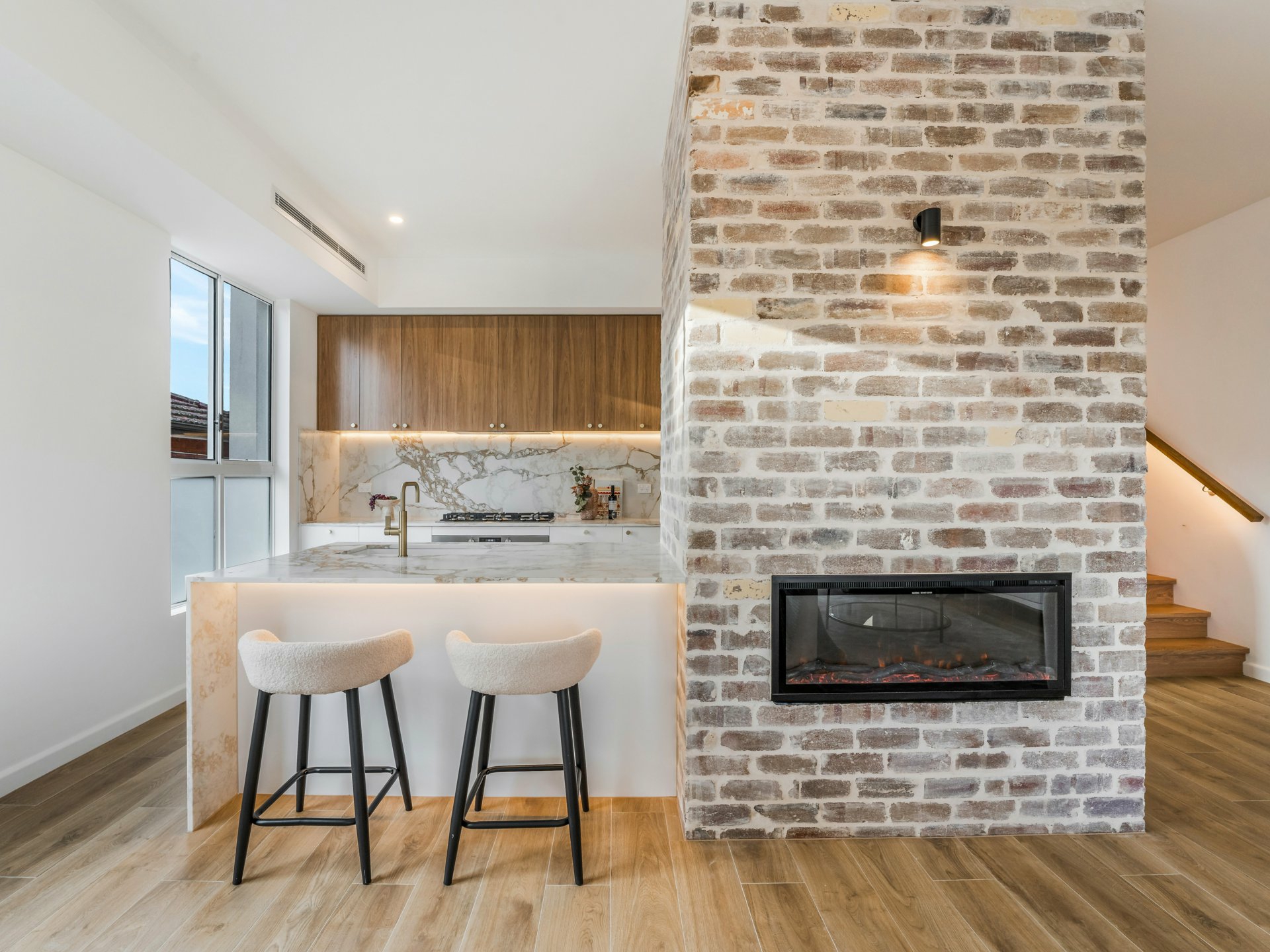 • Large light filled open plan living and dining with exposed brick and fireplace