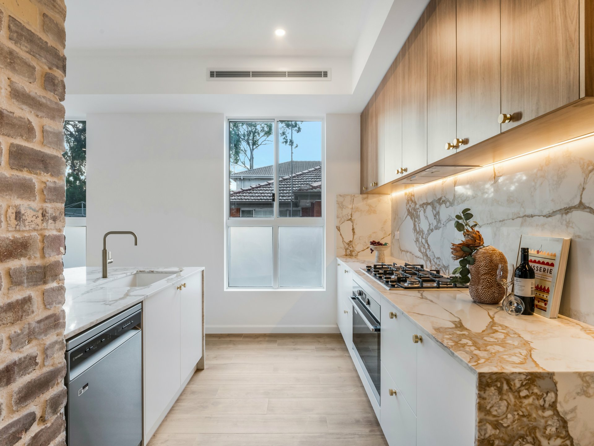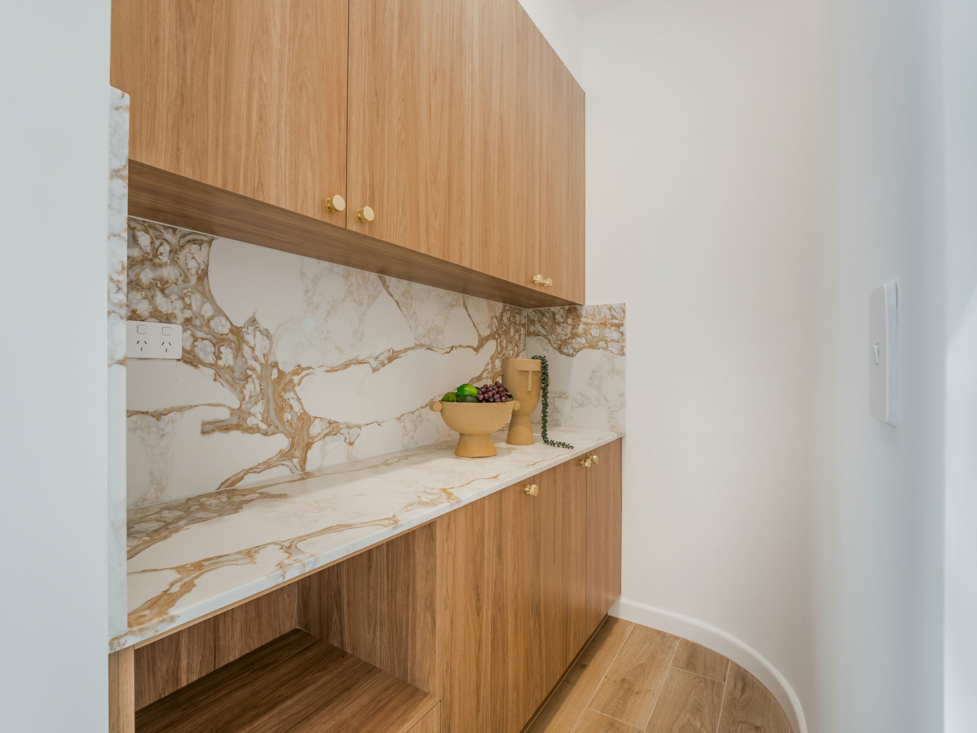 • Polyurethane gas kitchen with oro lusso stone benches and splash back
