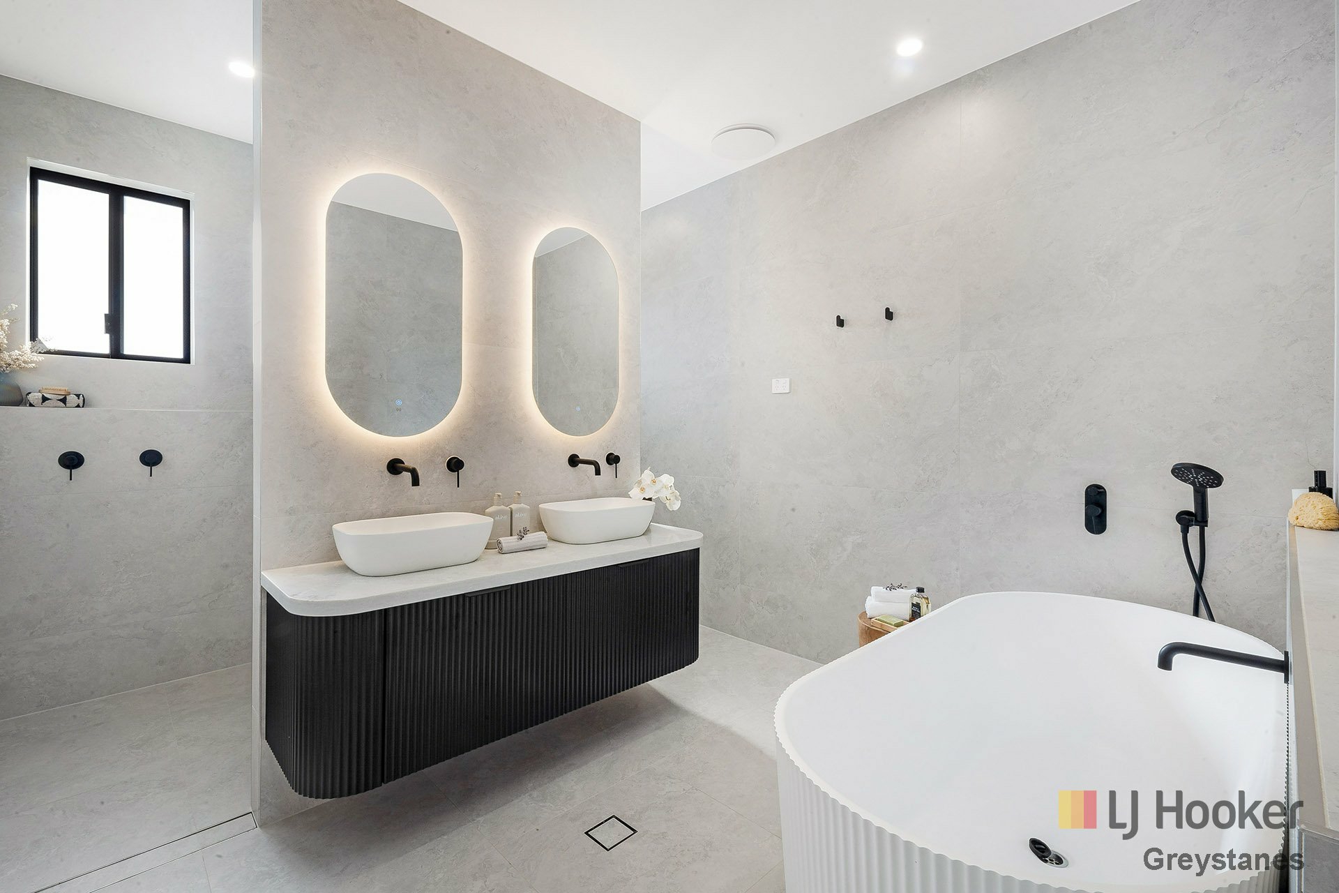 • Main bathroom with dual sinks, freestanding bath and oversized shower