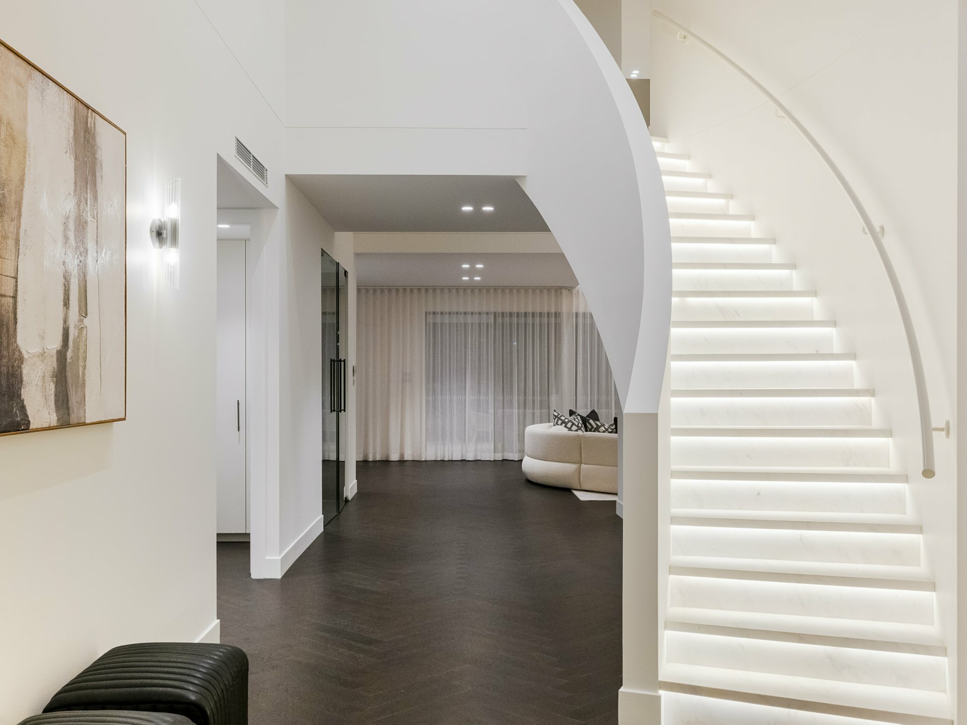 • Elaborate grand Danae Galaxy marble curved staircase, creating a stunning first impression on entry