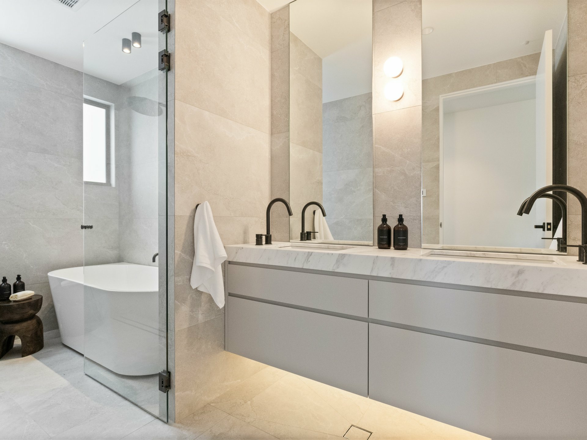 • Designer bathrooms with dual vanities, freestanding bath and elegant lighting