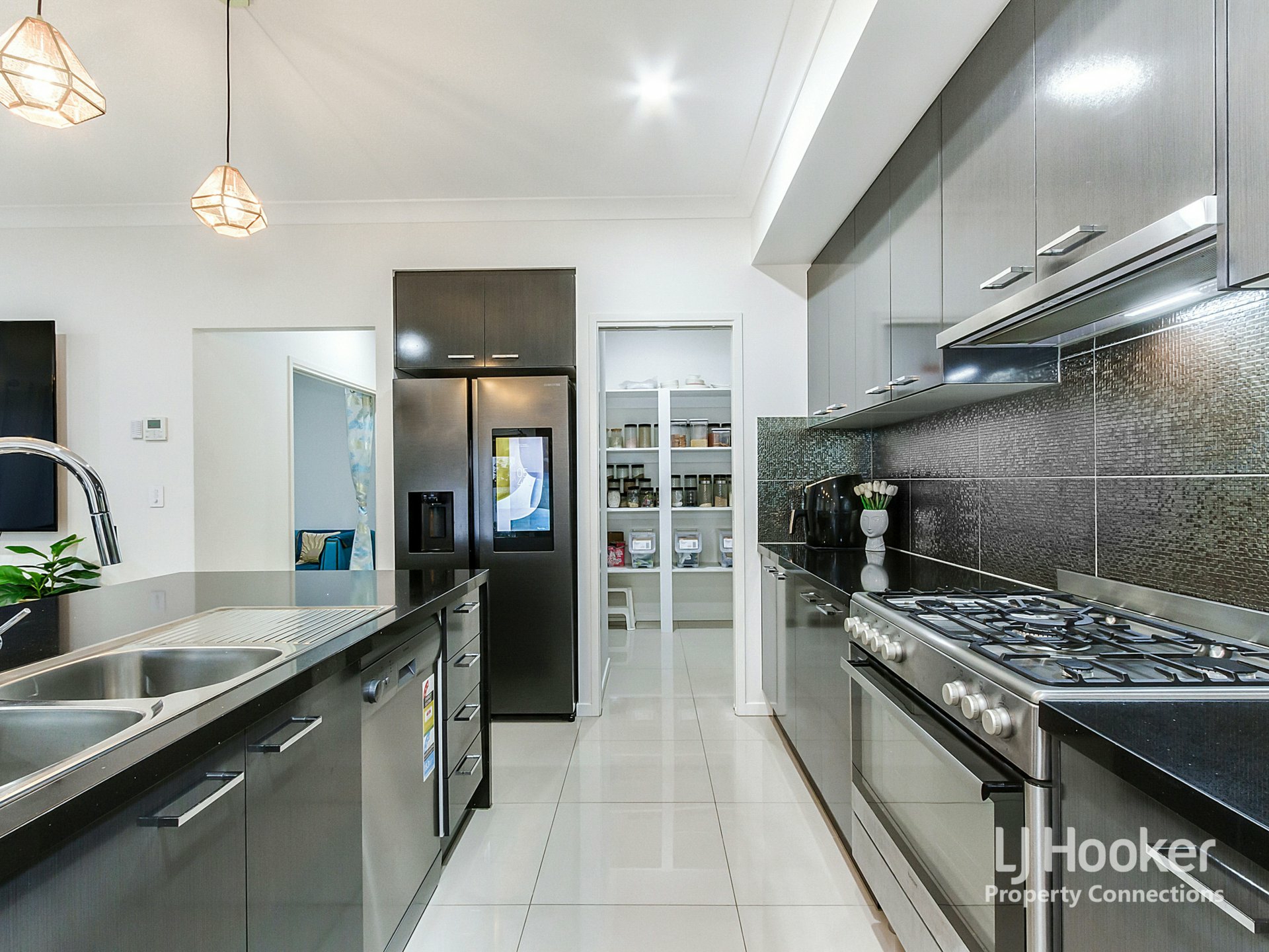 • Designer kitchen with 40mm stone waterfall benchtops and large walk-in pantry