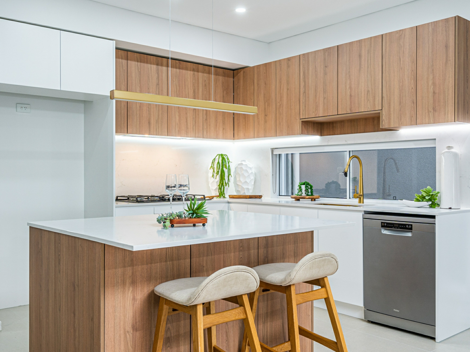 • Two- tone kitchen with stone benchtops 900mm gas cooktop, island bar and dishwasher