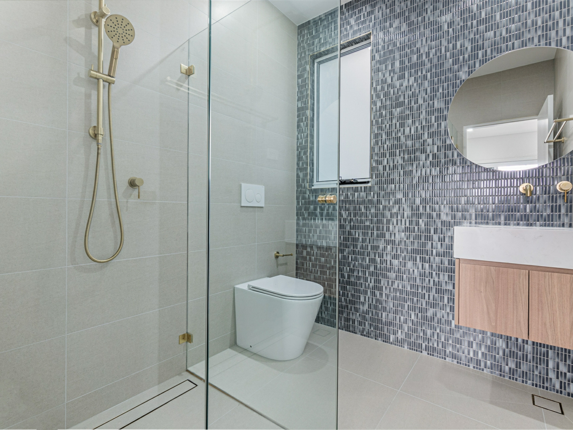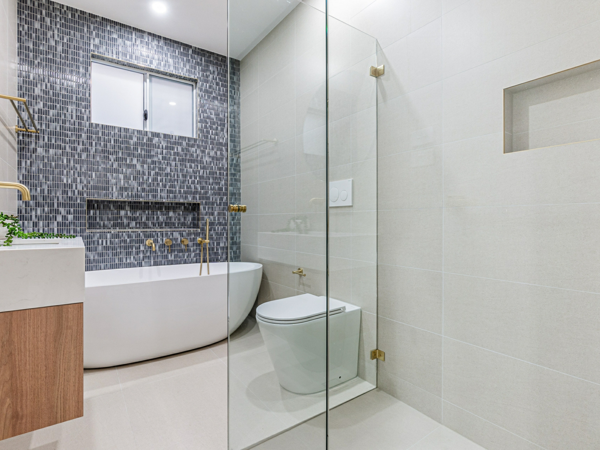 • Ultra-modern bathroom with floating vanity, freestanding bath, separate shower and rose gold tap-ware.