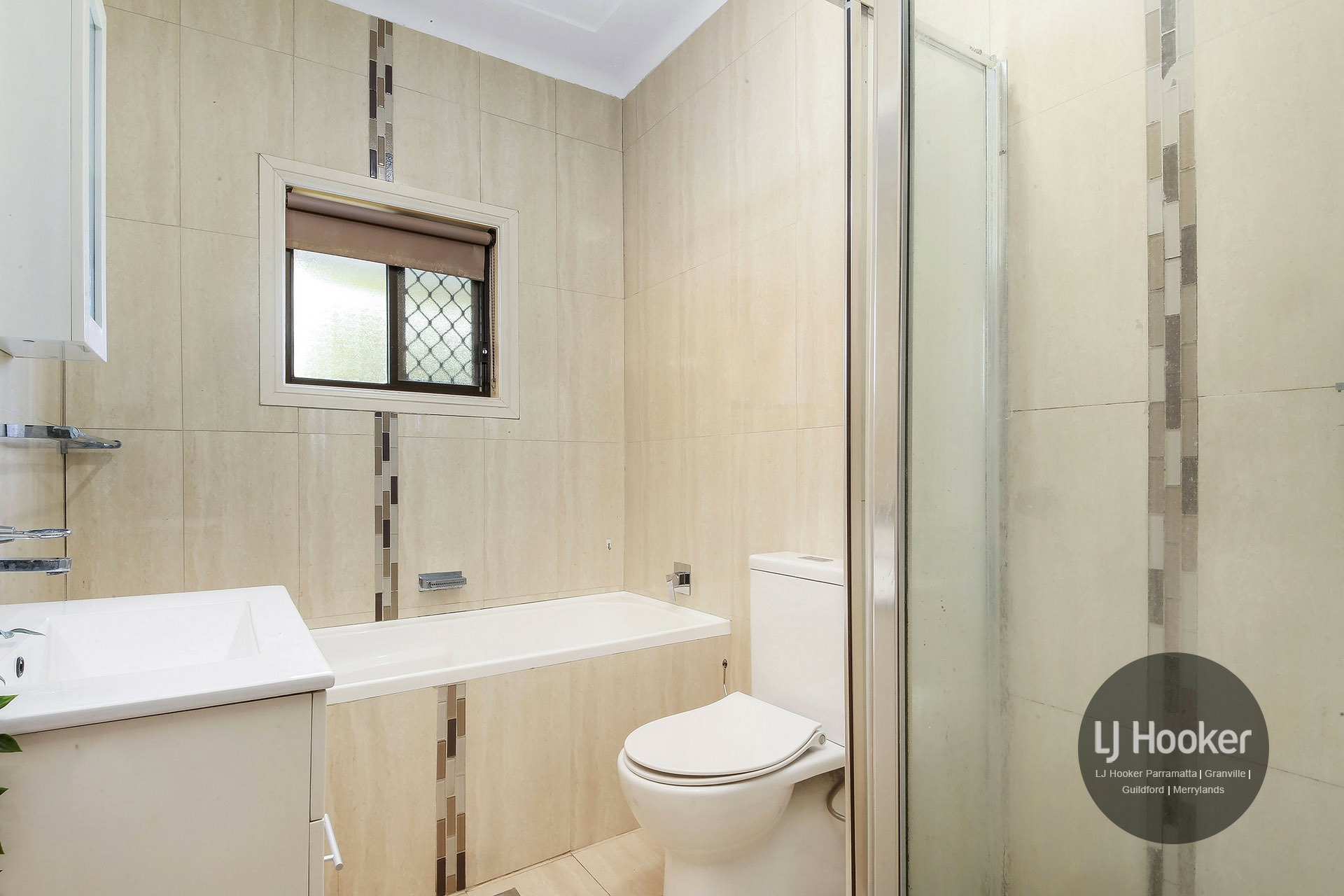 • Floor-to-ceiling tiled bathroom with separate shower and bath