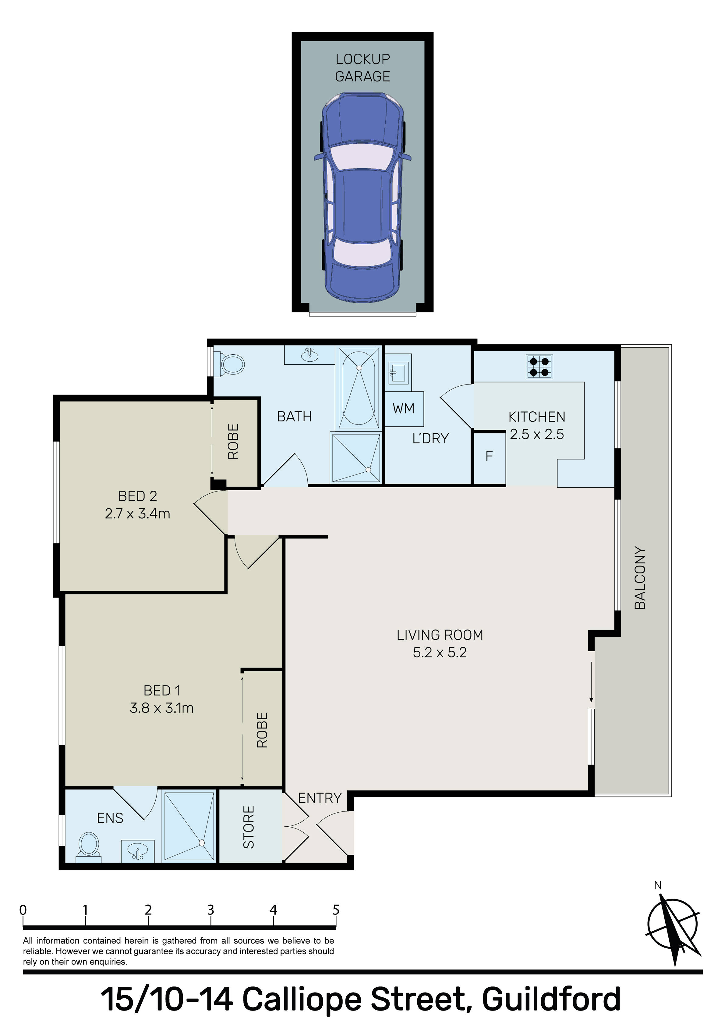 The home includes two well-sized bedrooms, both with built-in wardrobes, while the master bedroom enjoys the convenience of its own ensuite.
