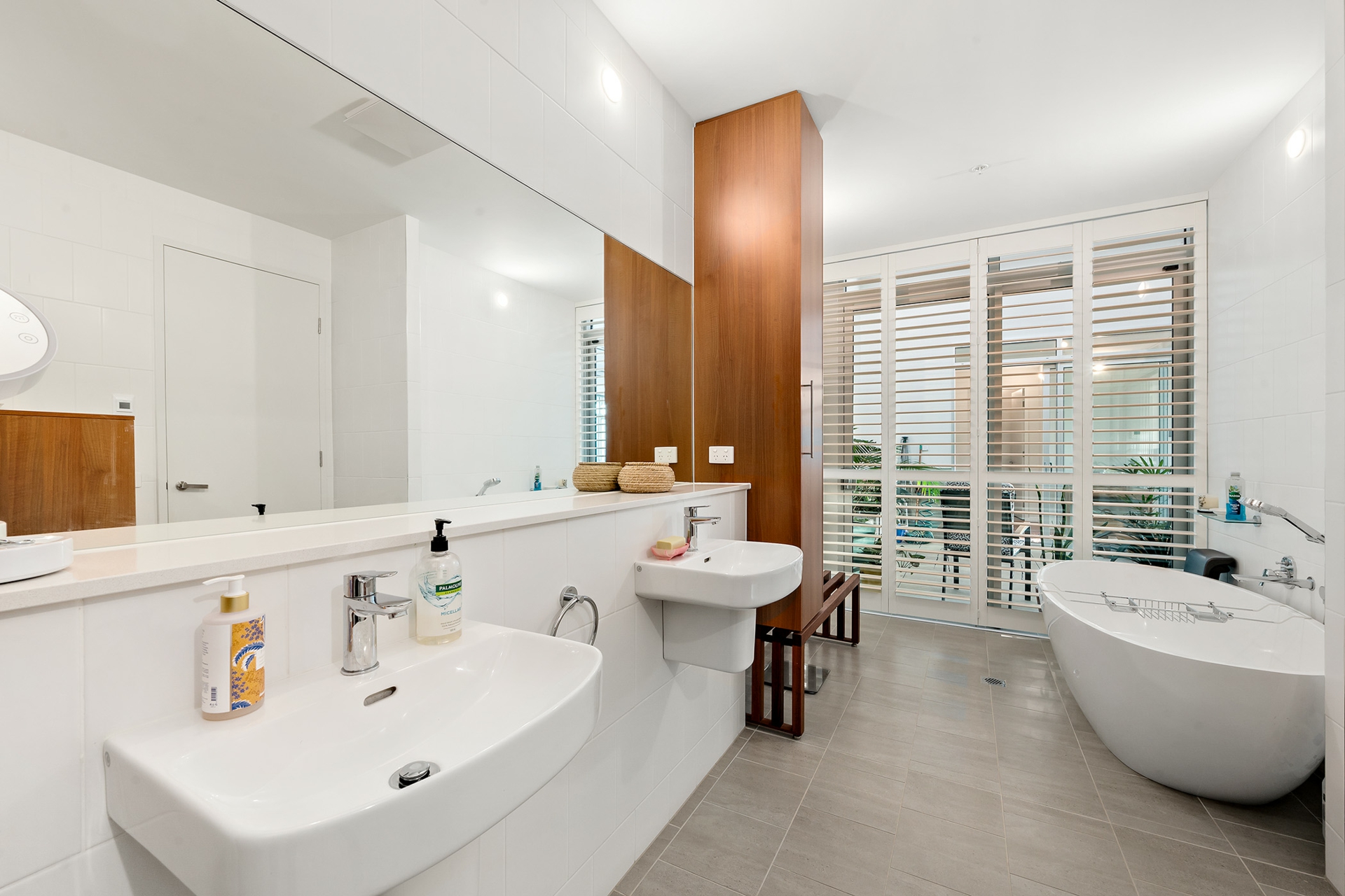 •Oversized ensuite with sumptuous standalone bath, frameless shower screen, large rain shower head, double vanity, Grohe tapware and custom joinery with storage