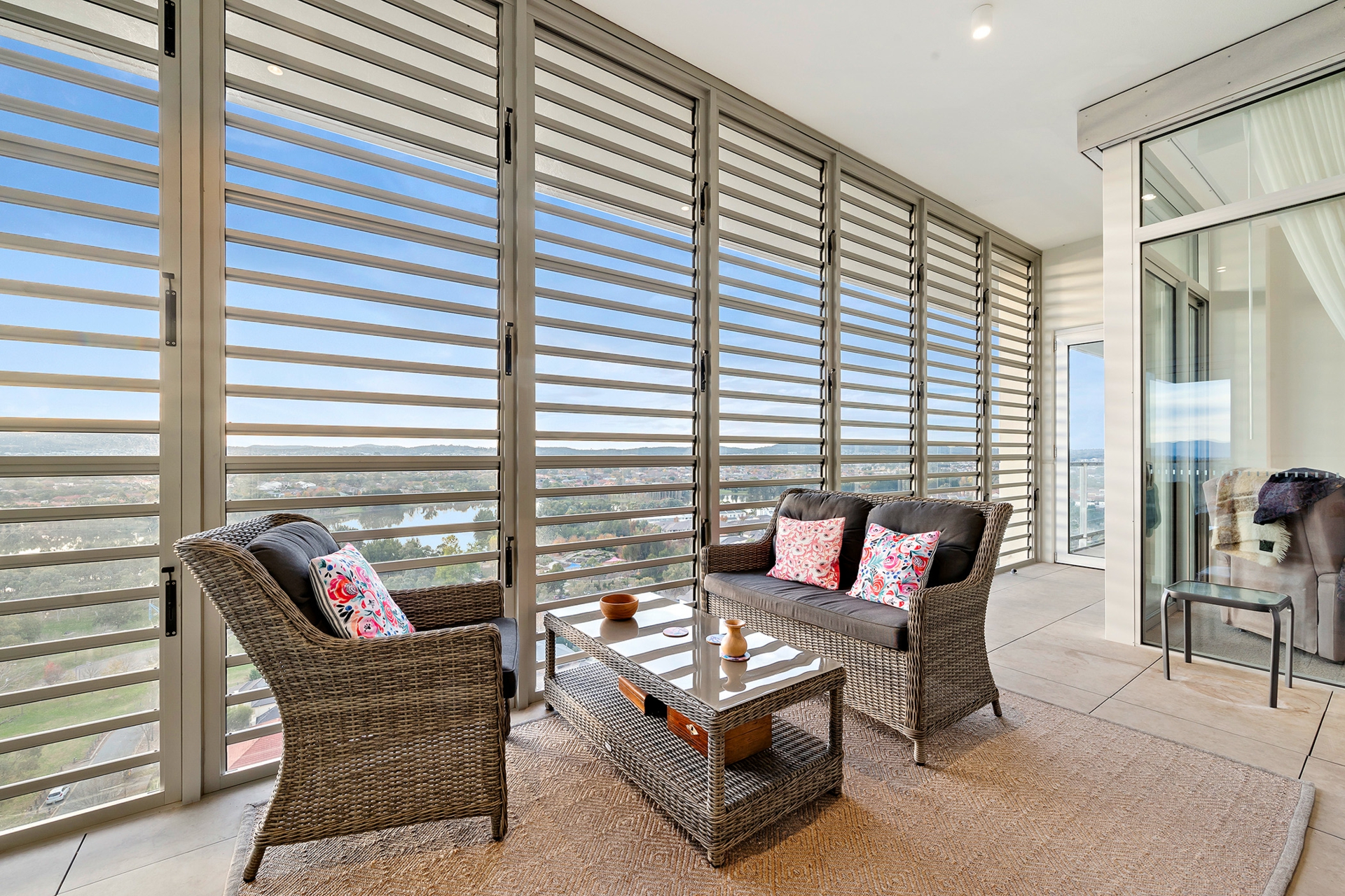 •Large, enclosed Winter balcony with glass louvered windows