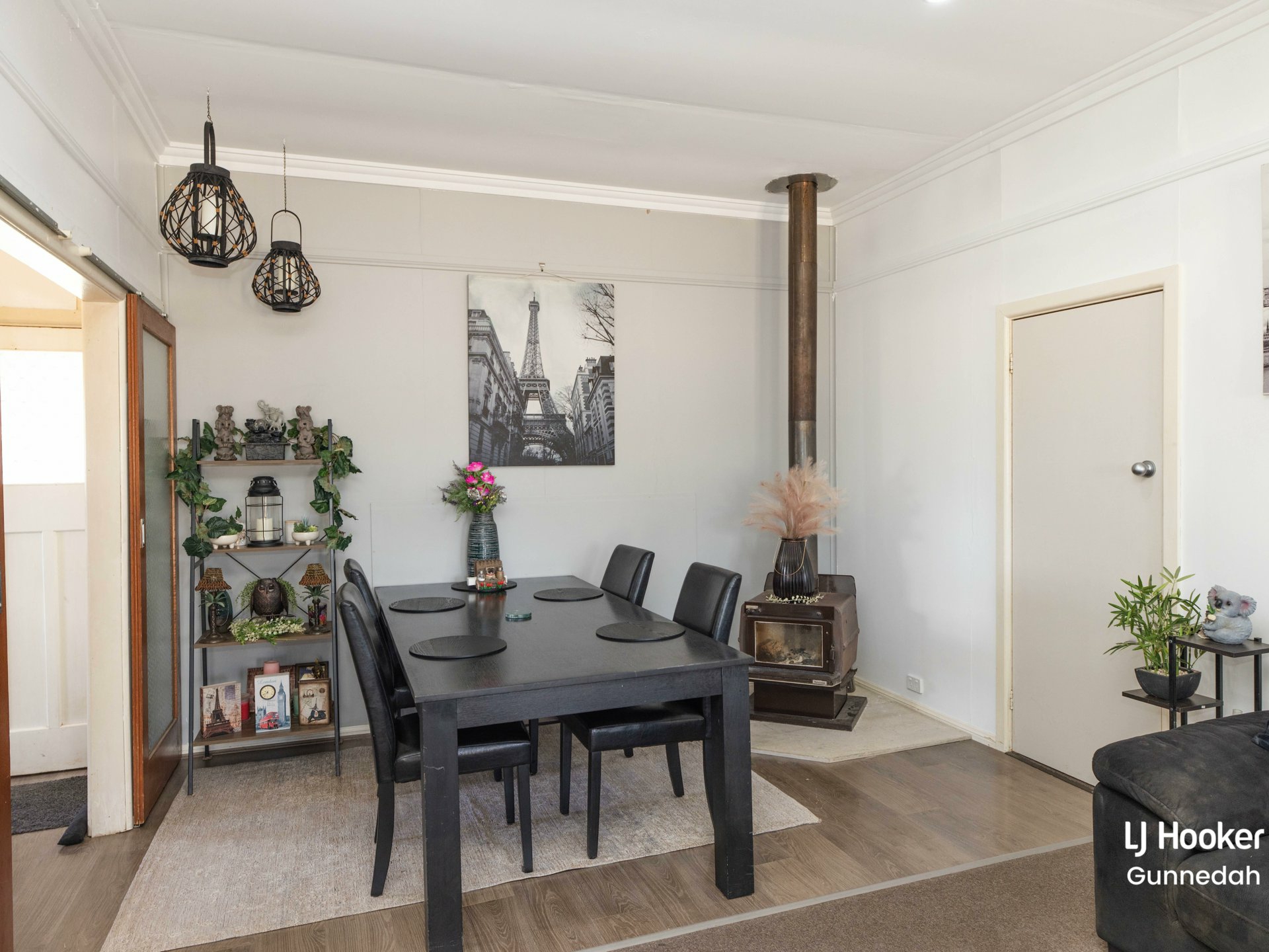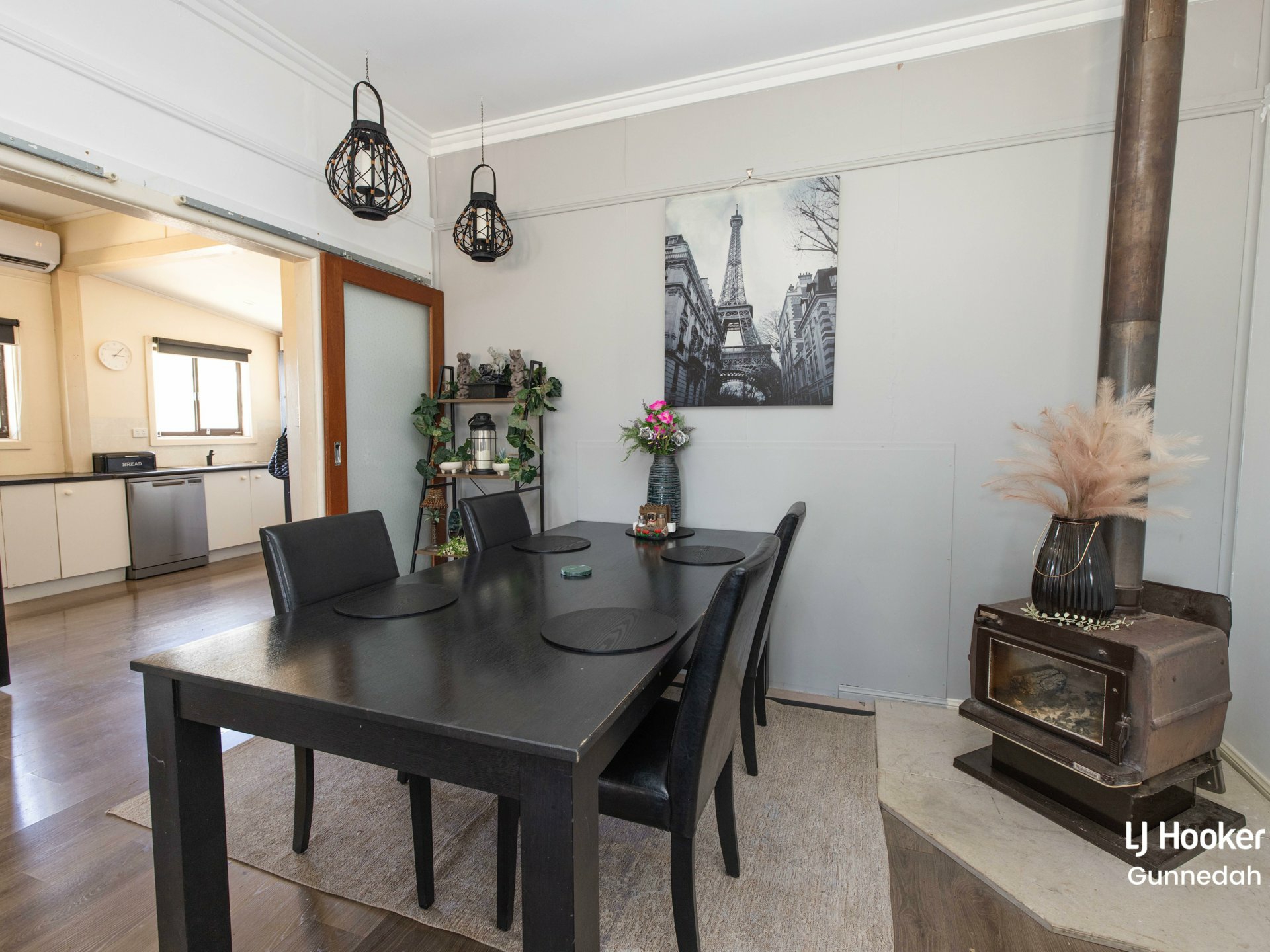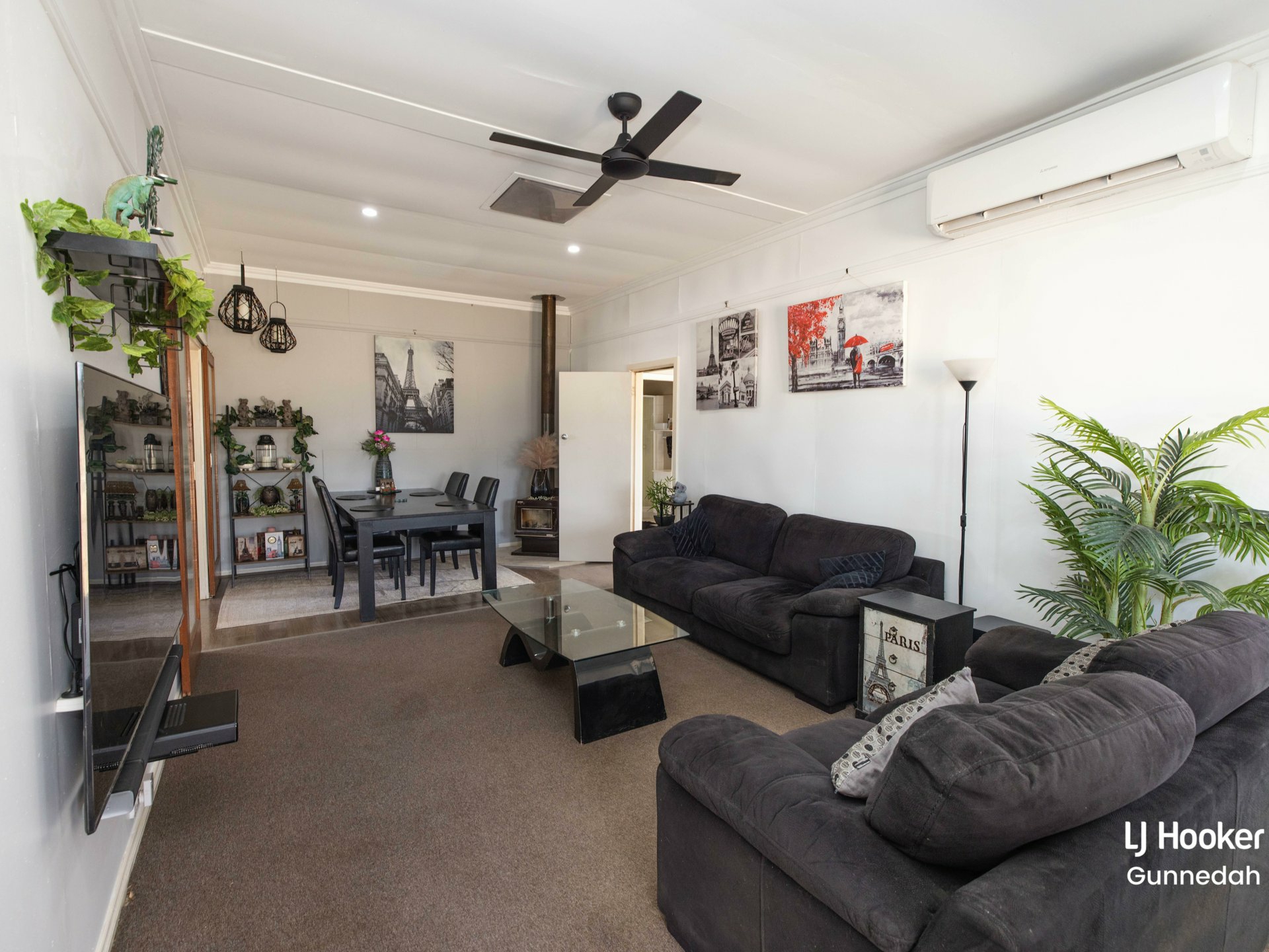 - Large living and dining room with wood fire heater and split-system