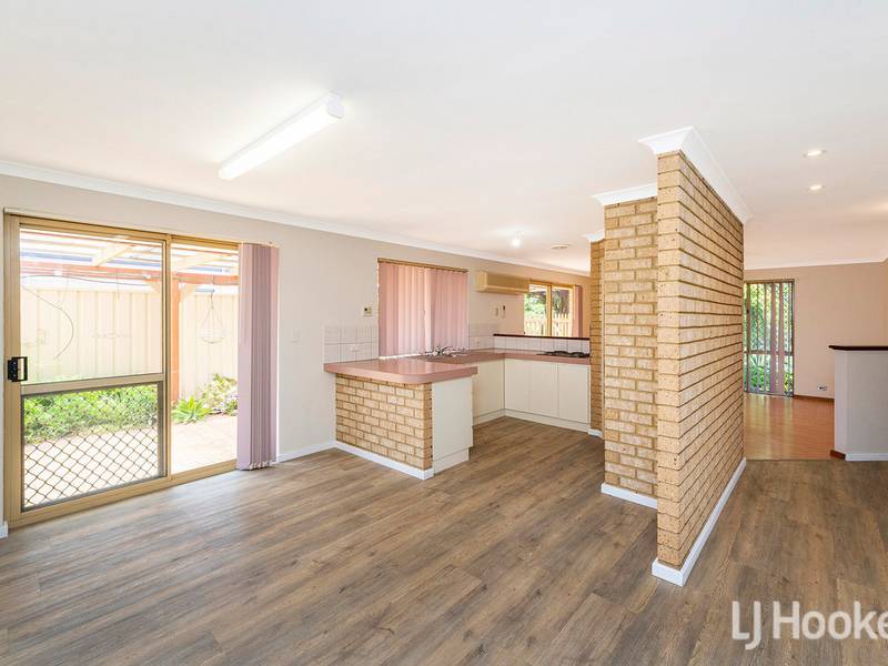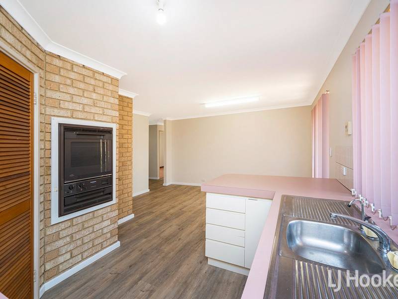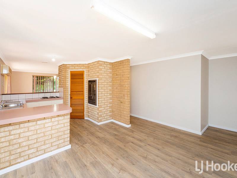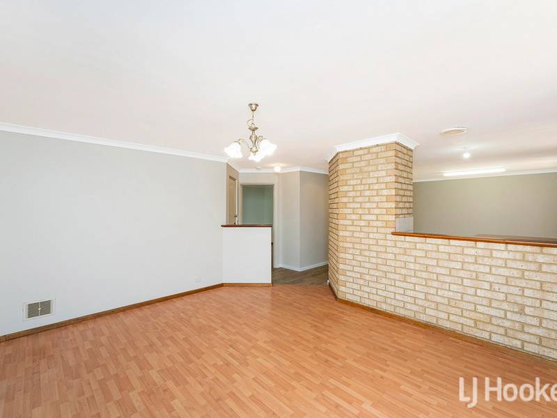 Kitchen overlooks spacious meals area and sunny lounge room.