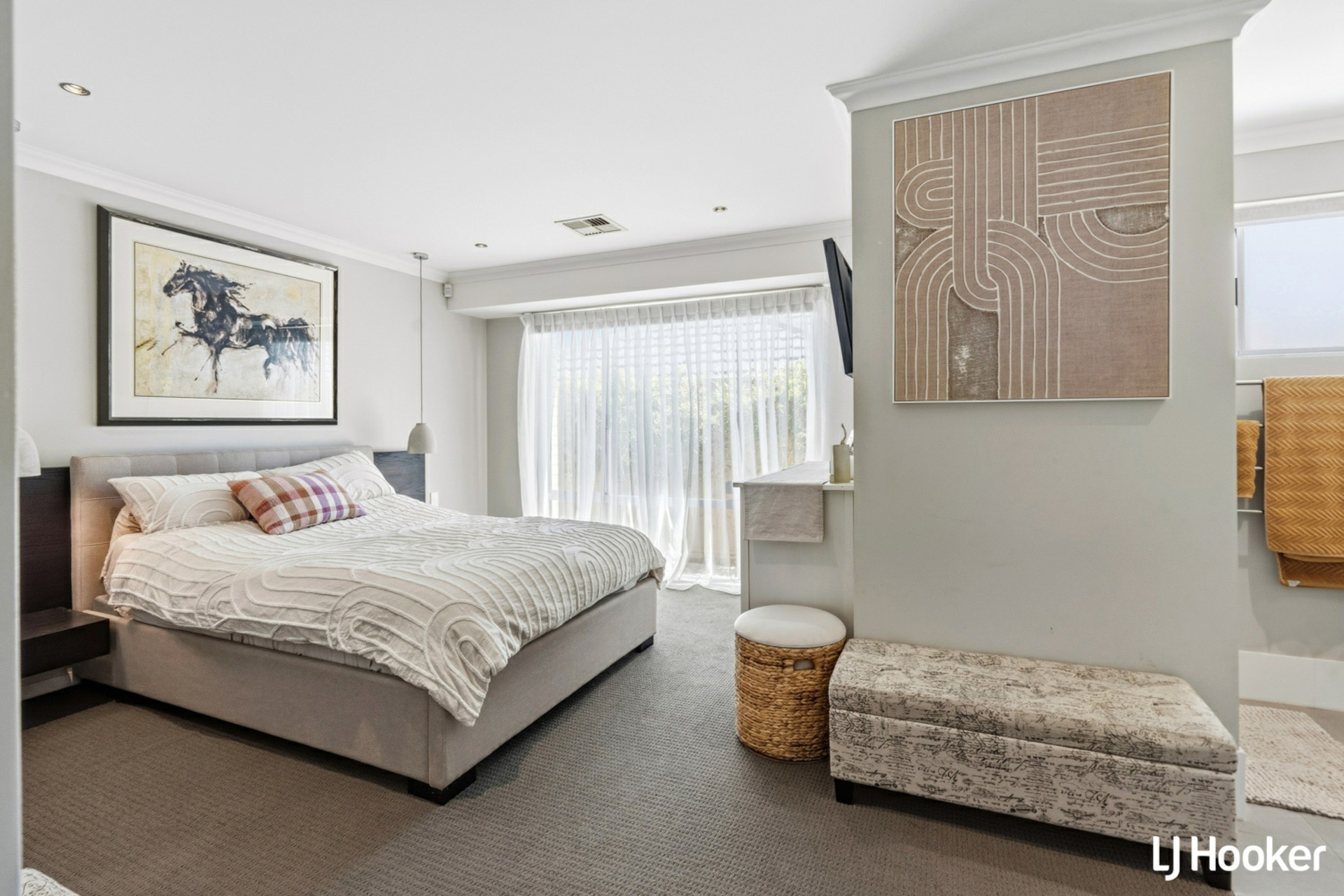 Step outside and you'll discover a private resort-style outdoor space designed for entertaining all year round. The expansive alfresco area with ceiling fan and café-style blind overlooks a stunning salt-chlorinated swimming pool framed by glass balustrading and quality granite paving. A grassed area with raised veggie garden bed and built-in Jarrah seating creates a relaxed environment perfect for family gatherings.