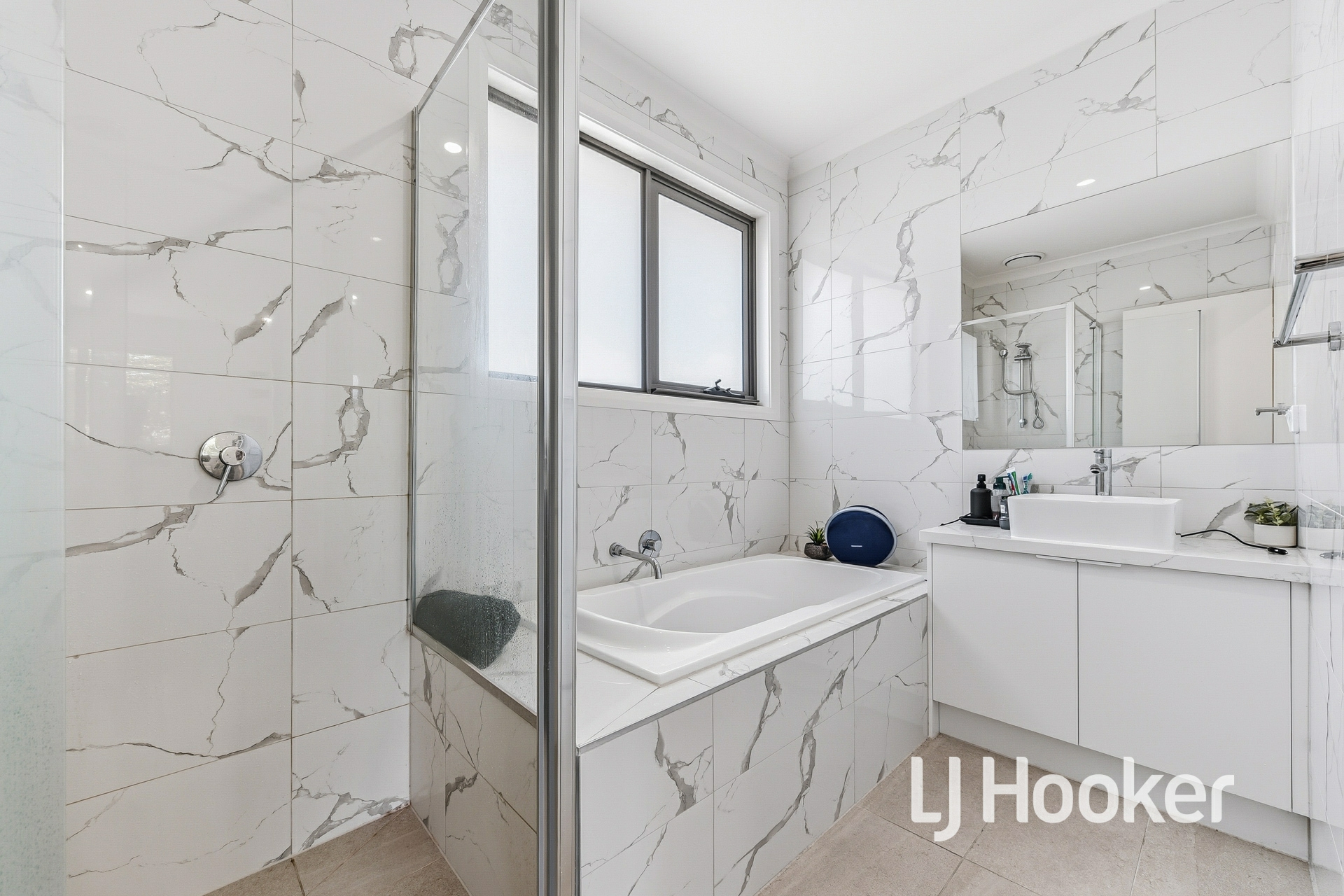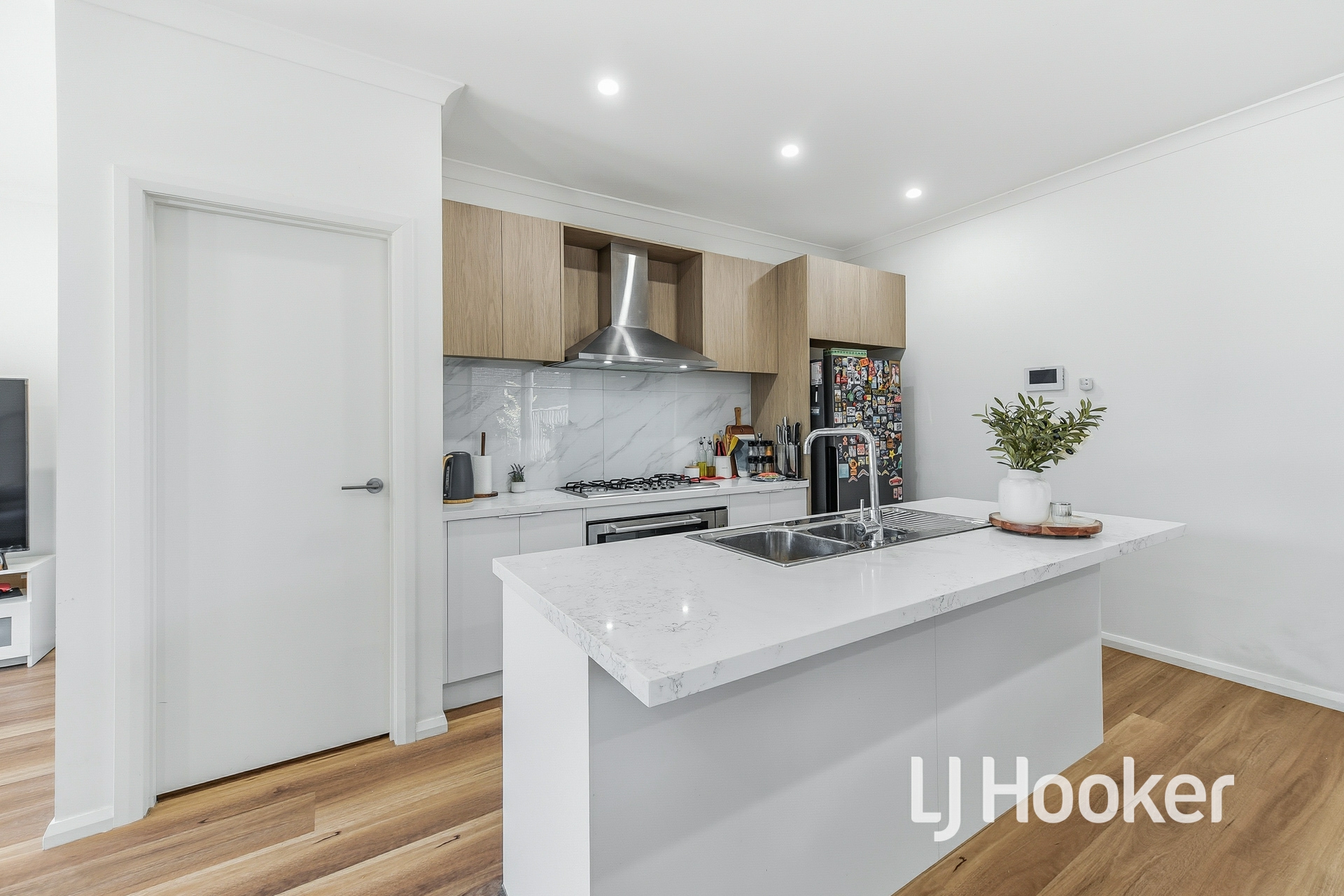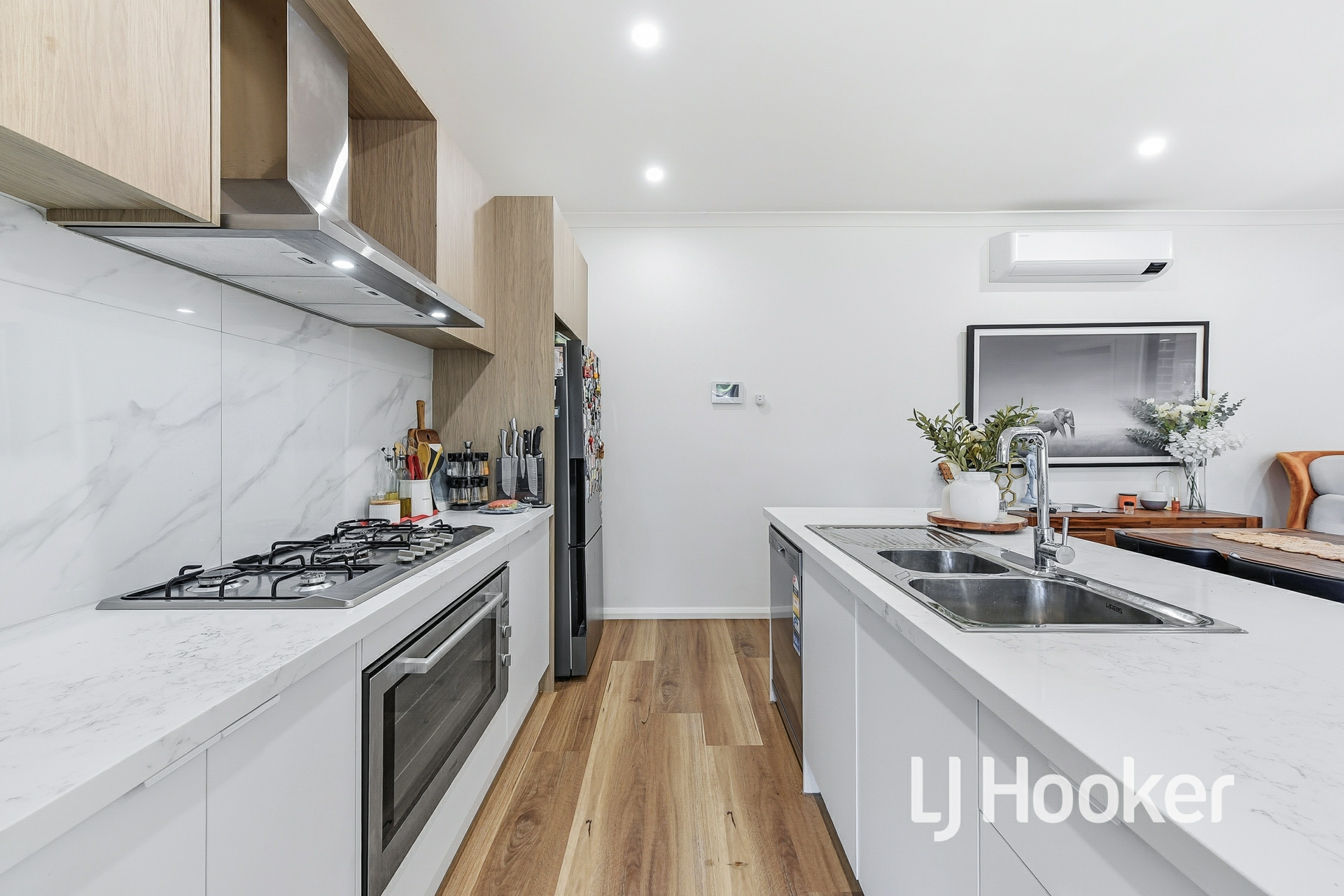 • Designer kitchen with marble splashback, stealth black appliances & 40mm stone benchtops