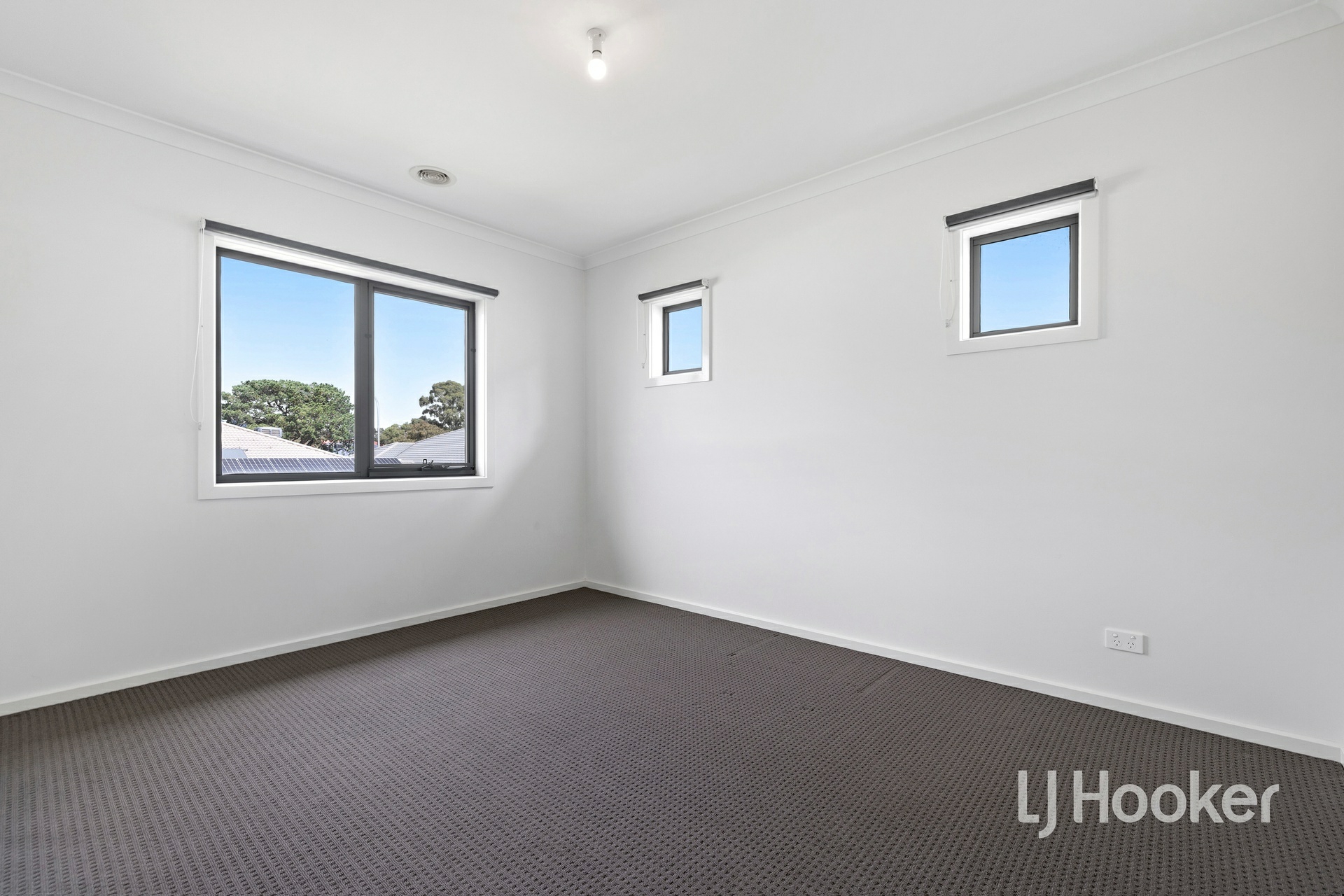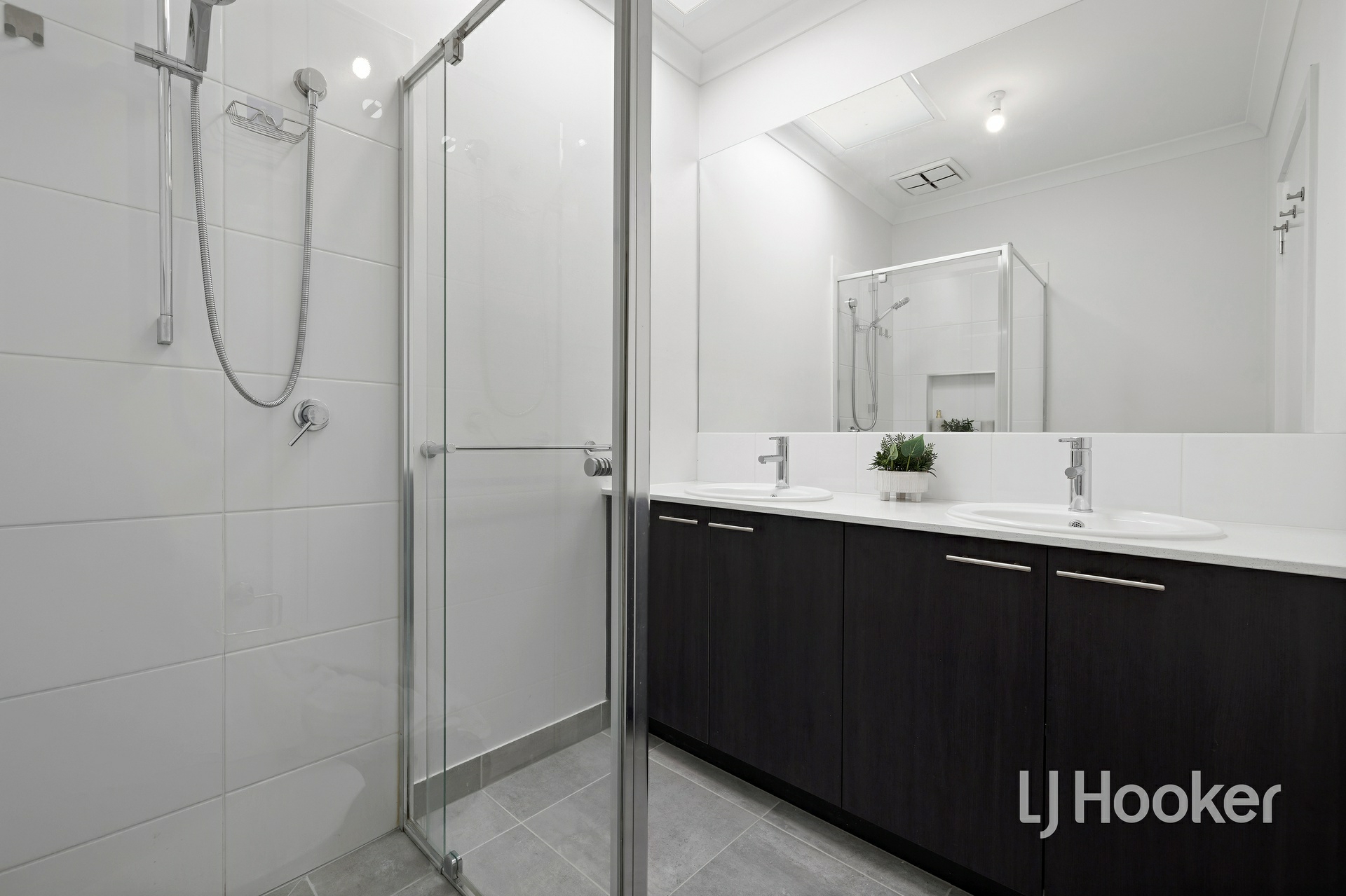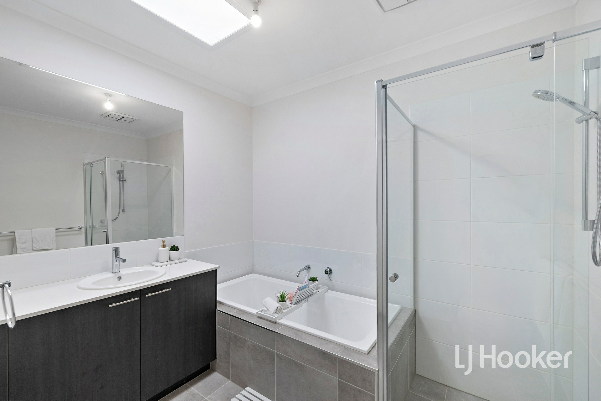 Upstairs, there are two well-sized bedrooms, each fitted with mirrored built-in robes, serviced by a large central bathroom complete with a skylight that fills the space with natural light and 40mm stone benchtops. The master bedroom is a true retreat, offering a full ensuite with his and hers vanity, a skylight, 40mm stone benchtops, a large walk-in robe, and a split system for added comfort. Enjoy a lovely outlook towards the Dandenong Ranges from the master.
