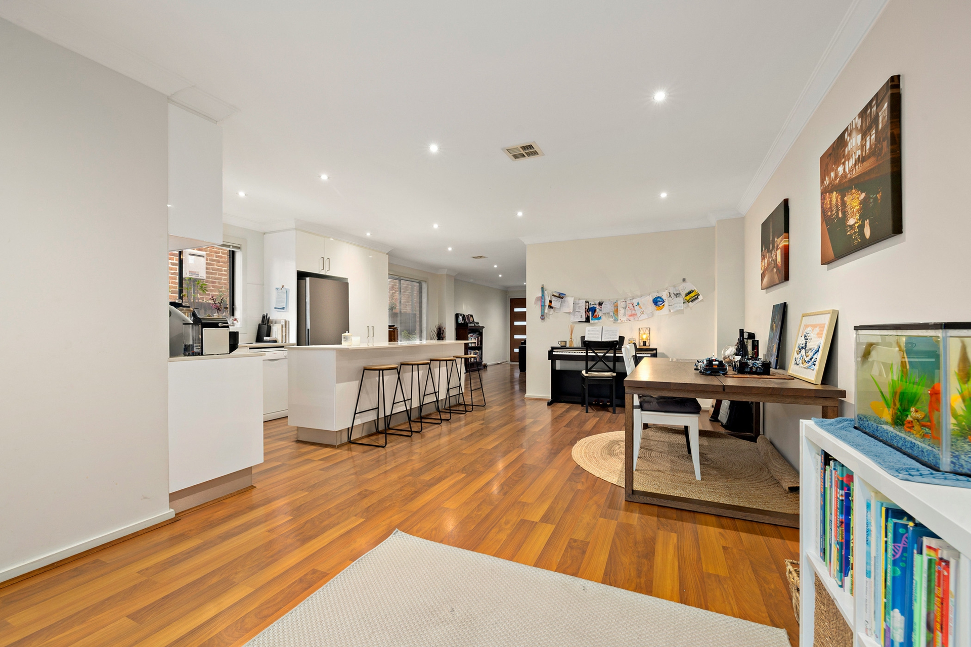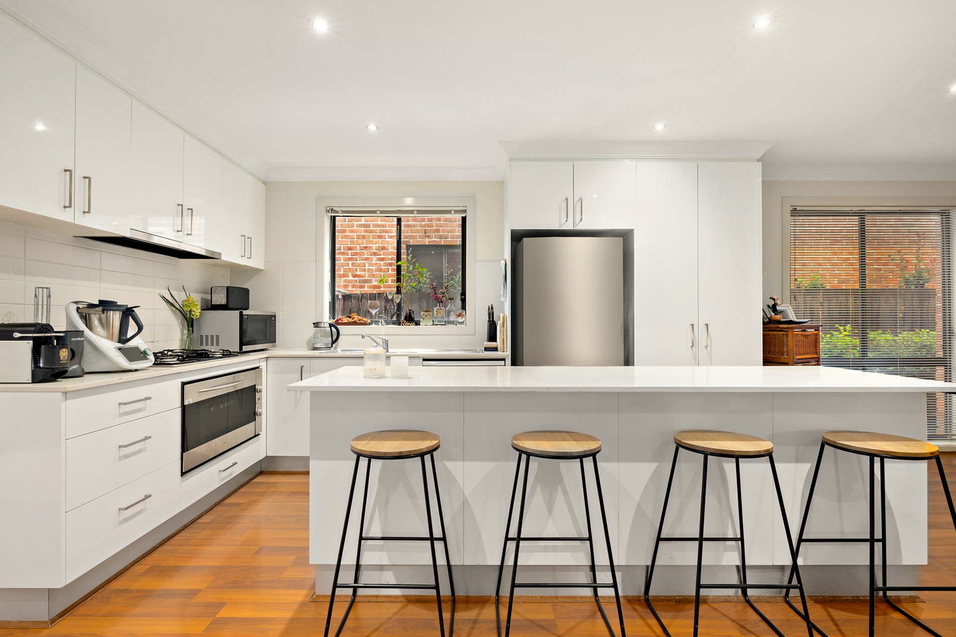 Step inside to discover two spacious living areas on the ground floor, providing flexibility for both formal and casual living. The heart of the home is the modern kitchen, complete with gas cooking, an island bench and breakfast bar, perfectly positioned to connect with the dining and living spaces.